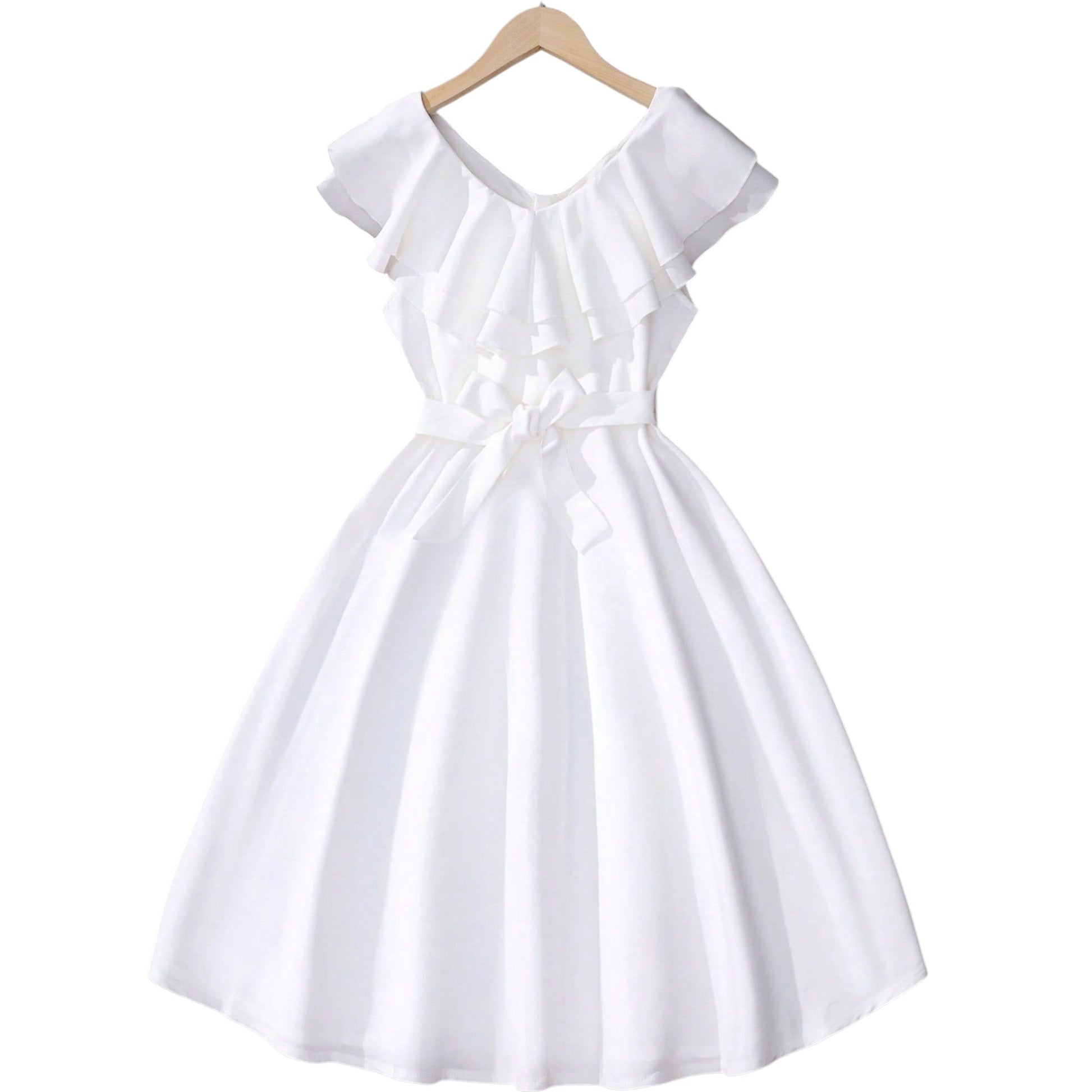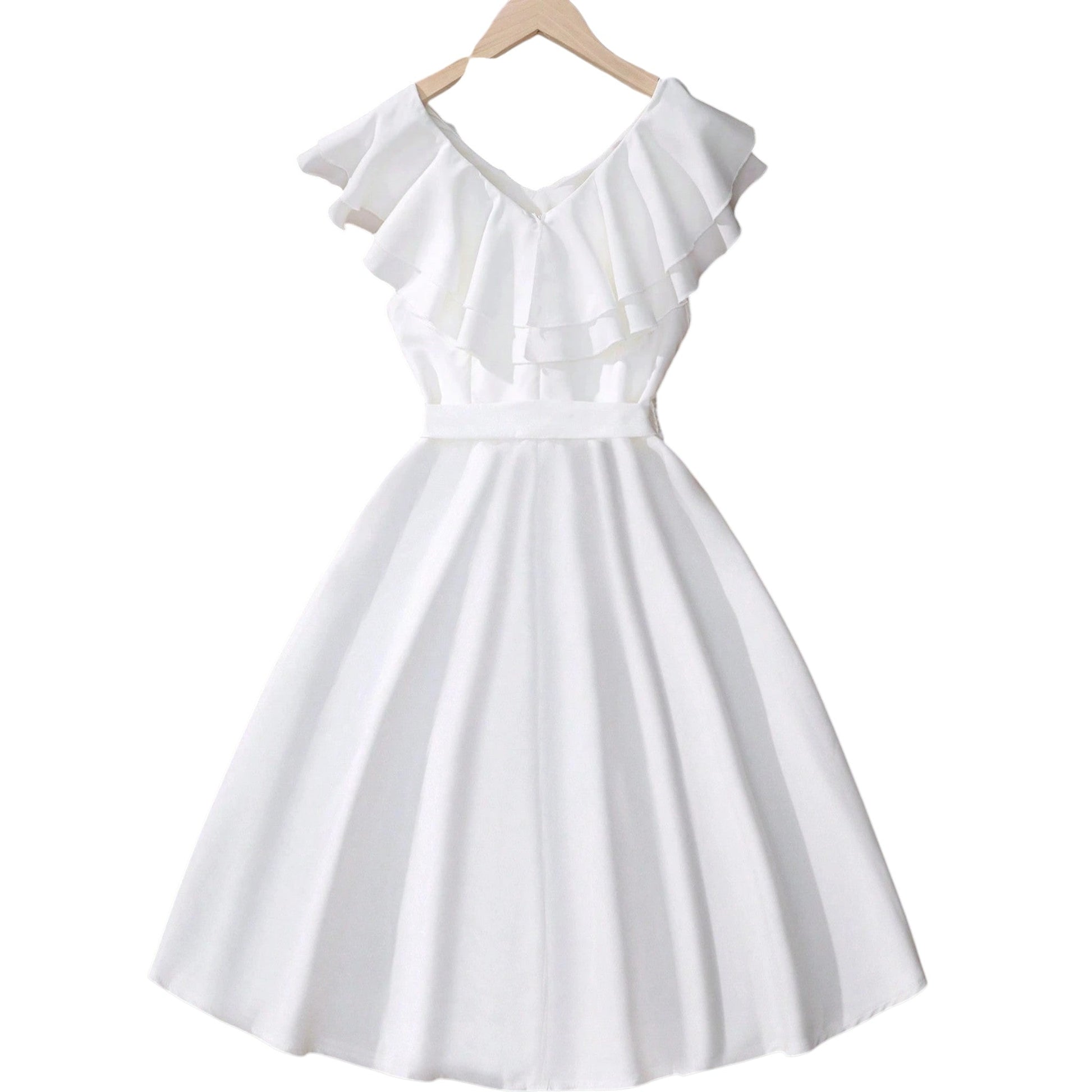 Címke nélküli, ekrü, fodros V-nyakú, rövid ujjú, derékban megkötős, A vonalú, mini ruha.