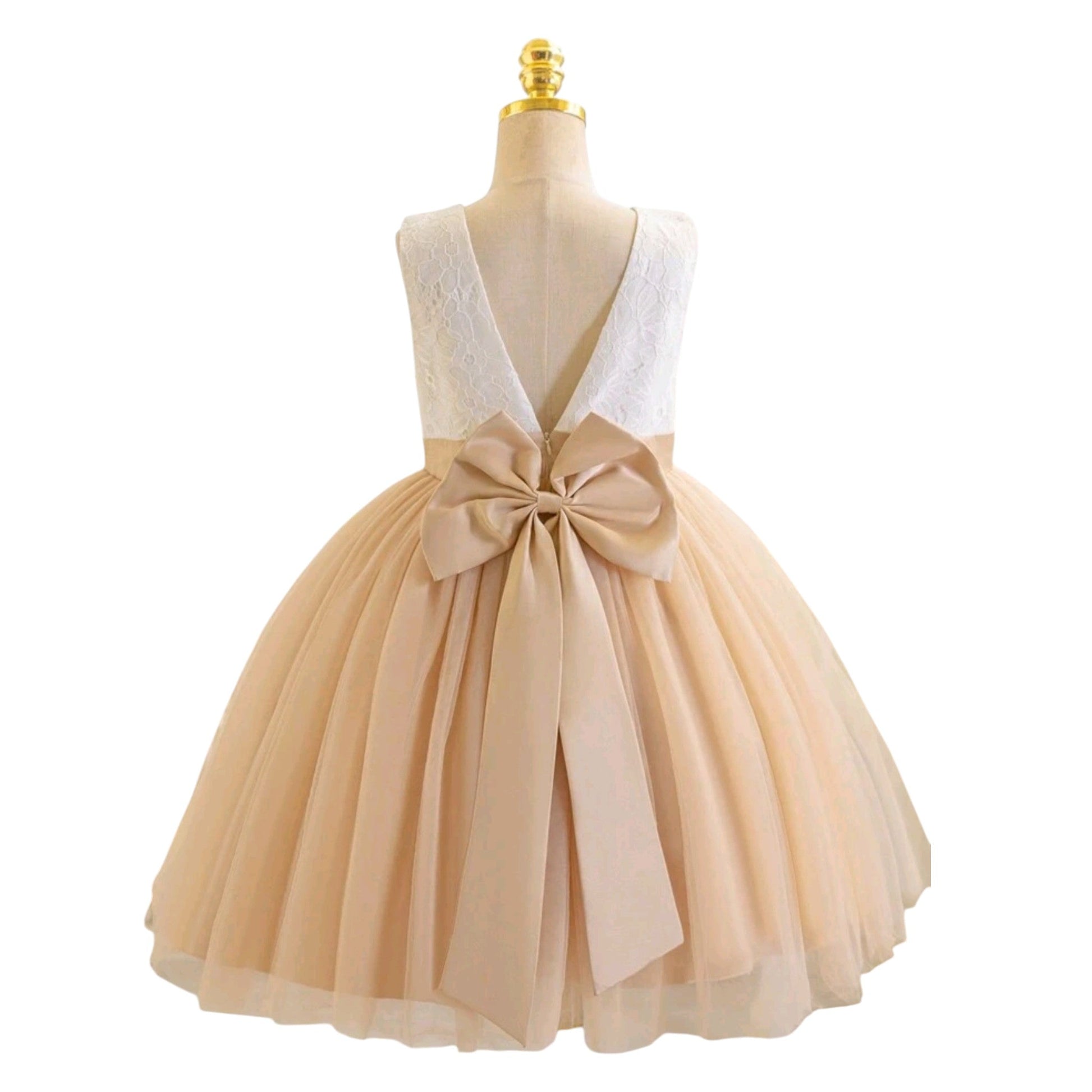 Címke nélküli, bézs és fehér színű, csipkés felsőrésszel és tüll szoknyával ellátott ujjatlan kislány ruha.