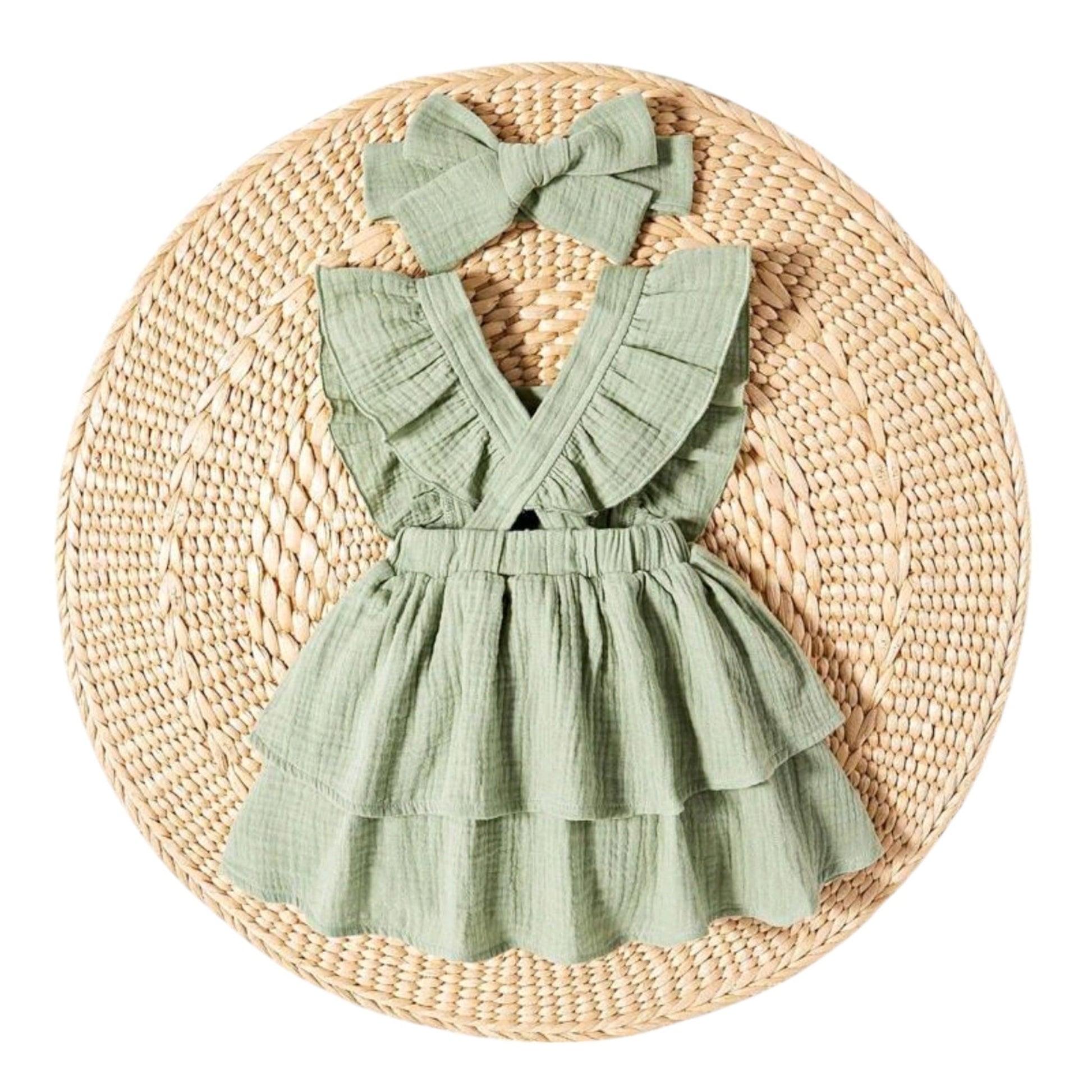 Címke nélküli, zsályazöld, muszlin anyag, fodros pántok, kétrétegű fodros szoknya, hozzáillő fejpánt.