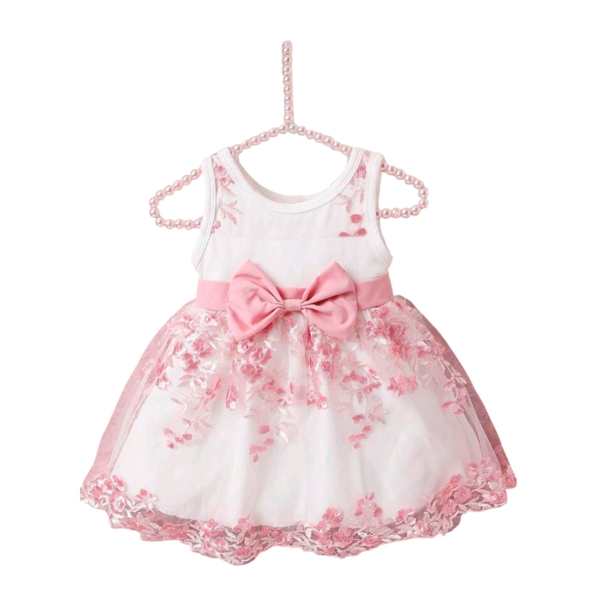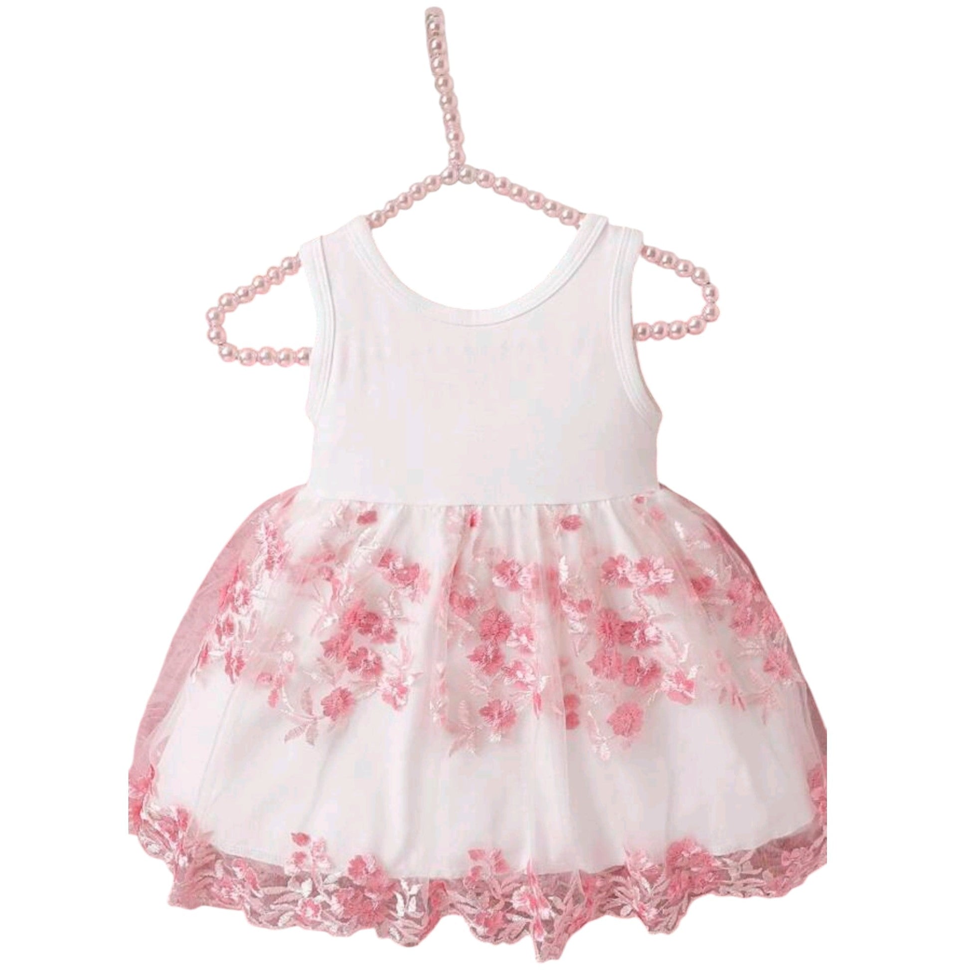 Címke nélküli, fehér és rózsaszín, ujjatlan, kerek nyakú, rózsaszín virágos hímzés, tüll alsószoknya, masni a deréknál.