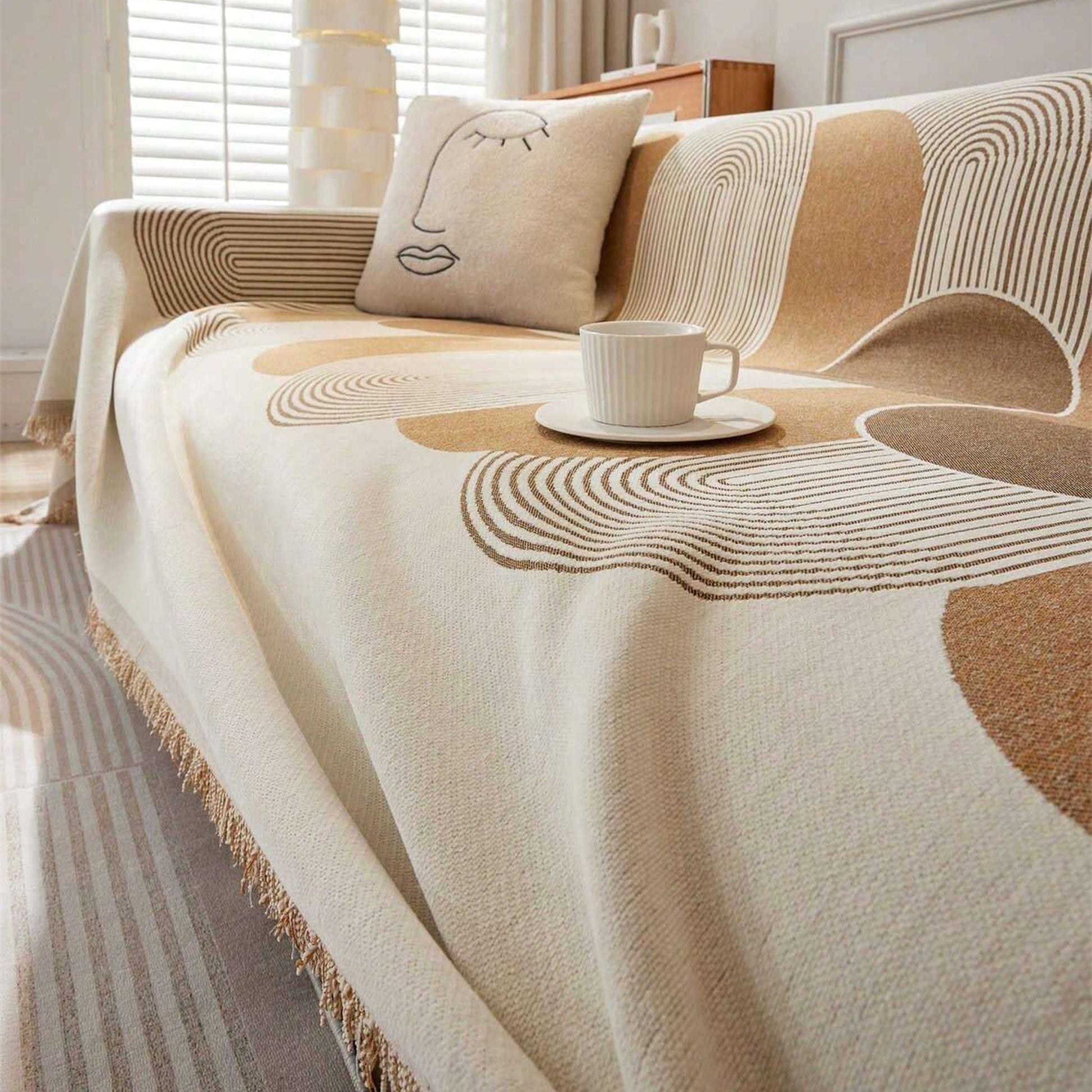 Címke nélküli, bézs, rojtokkal, geometrikus mintákkal.