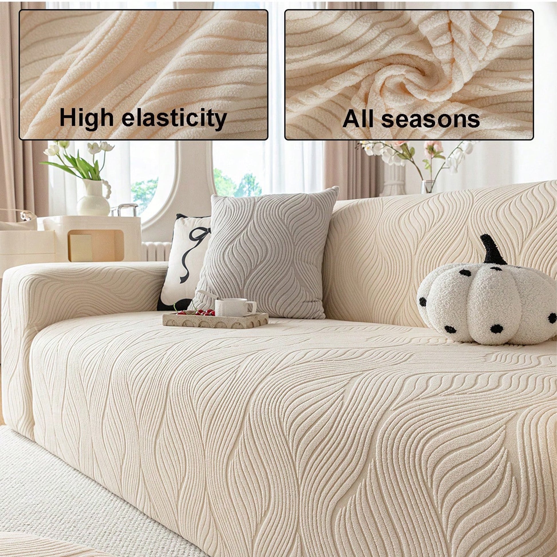 Címke nélküli, bézs, texturált, hullámos mintázatú, rugalmas kanapéhuzat. Tartalma: 1 párna és 1 kanapéhuzat