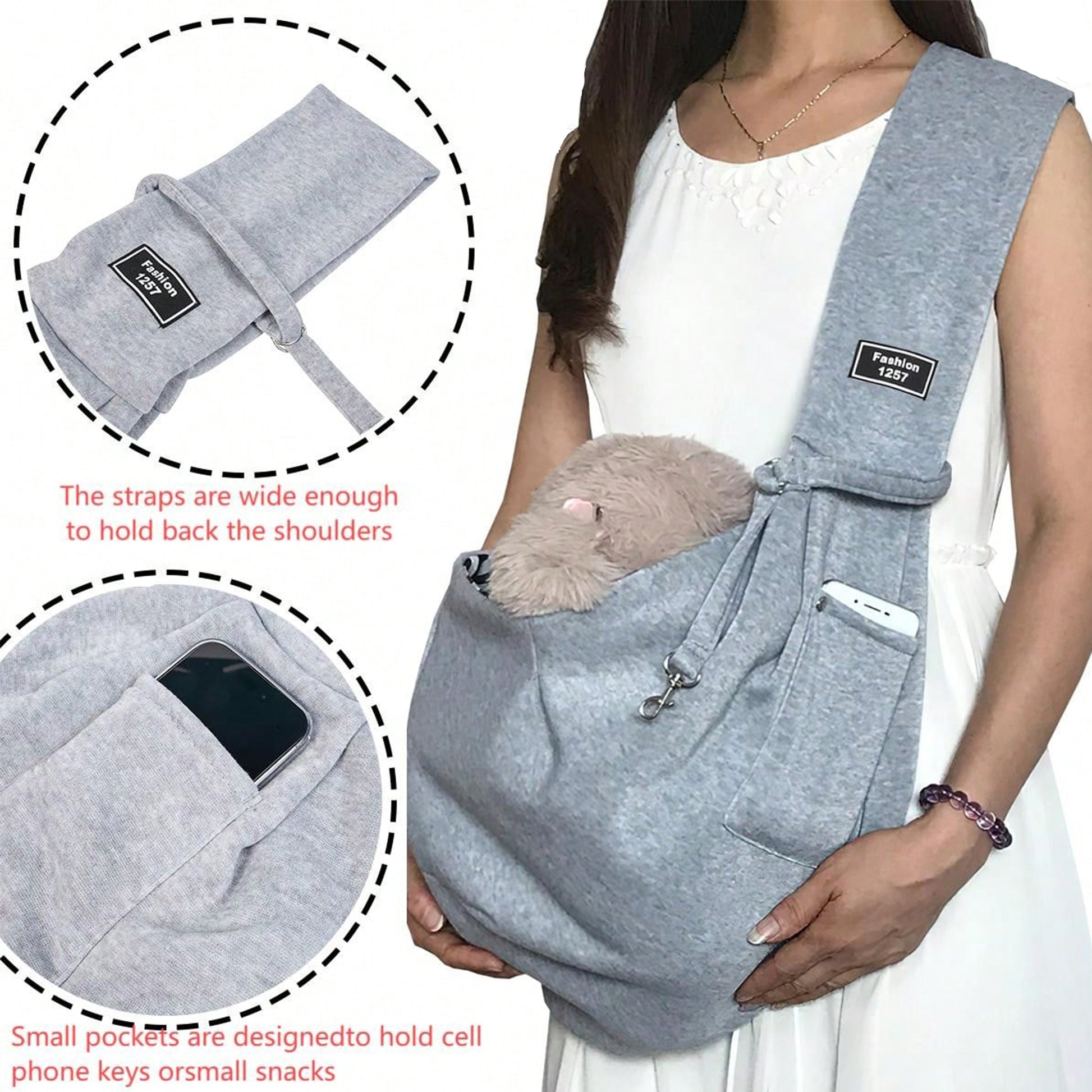 Címke nélküli, kék, vállra akasztható kisállat hordozó táska kis zsebbel a telefonnak, és a táska elején egy fém karabinerrel.