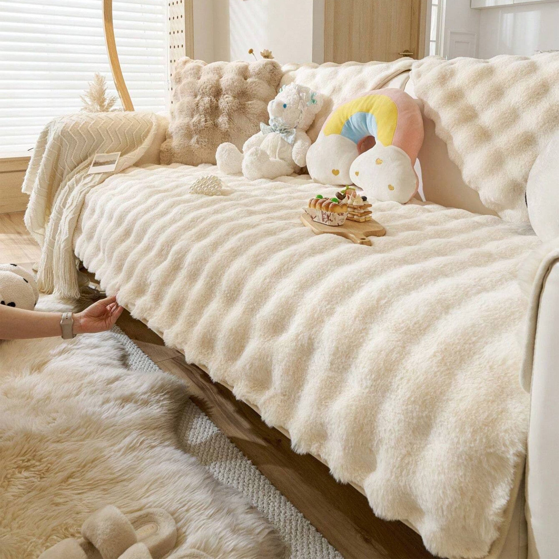 Címke nélküli, bézs, plüss, hullámos mintázatú, kanapé takaró.