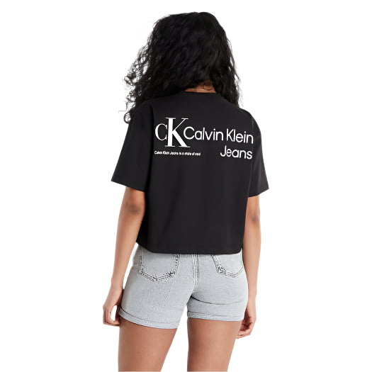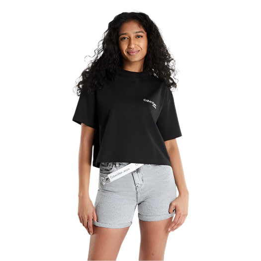 Címke nélküli, fekete színű, női crop póló. Rövid ujjú, kerek nyakkivágással rendelkezik.