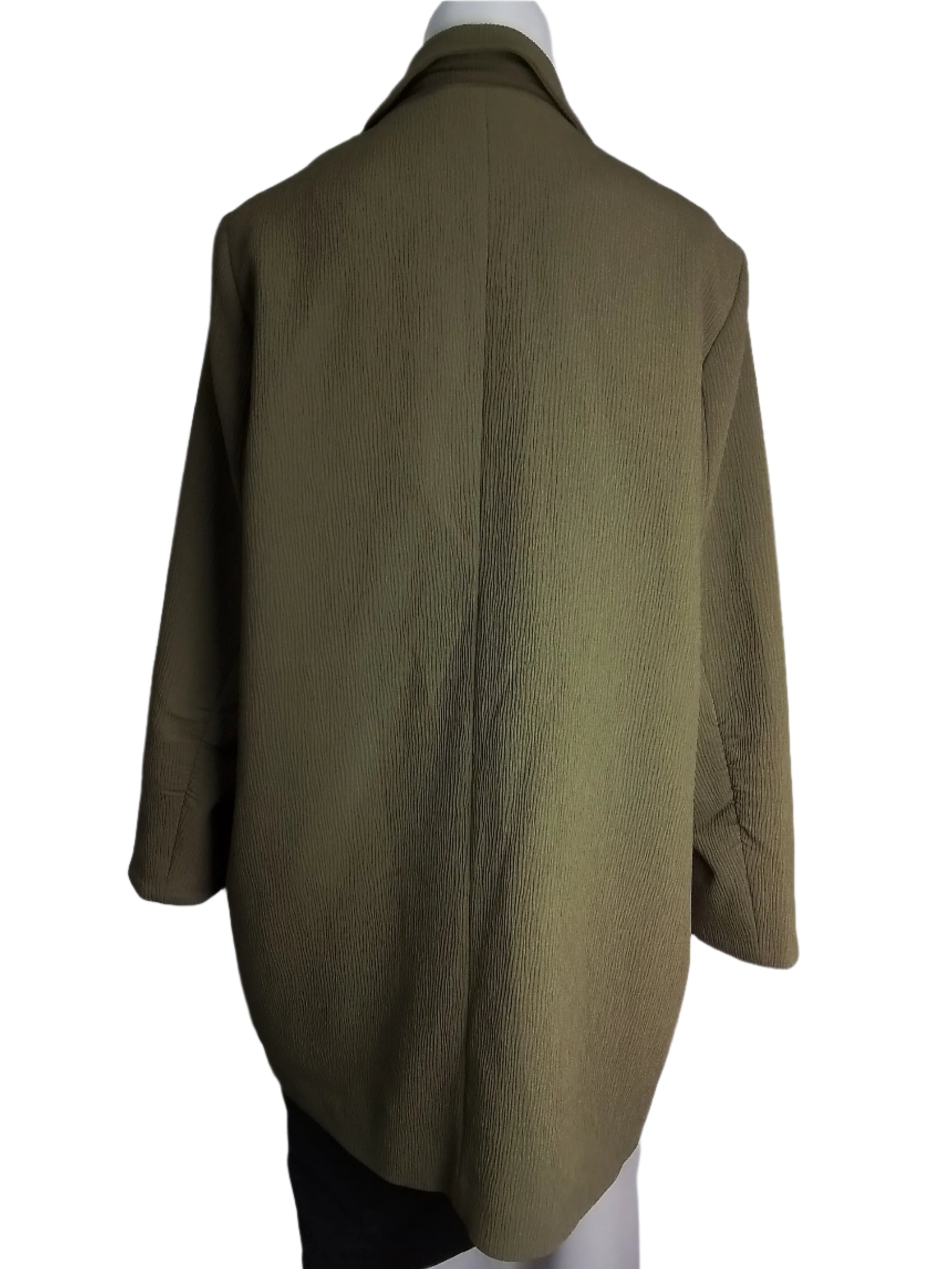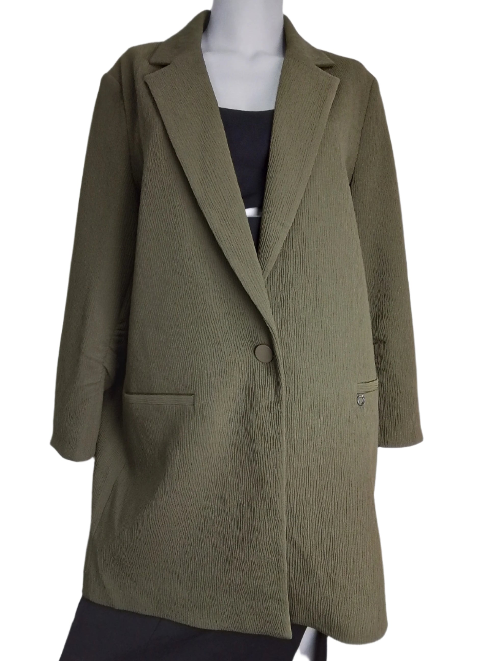Címke nélküli, khaki színű hosszú blézer, elegáns texturált anyagból. Letisztult szabásvonalakkal, egysoros záródással és zsebekkel. Tökéletes választás hétköznapi és alkalmi viselethez egyaránt.