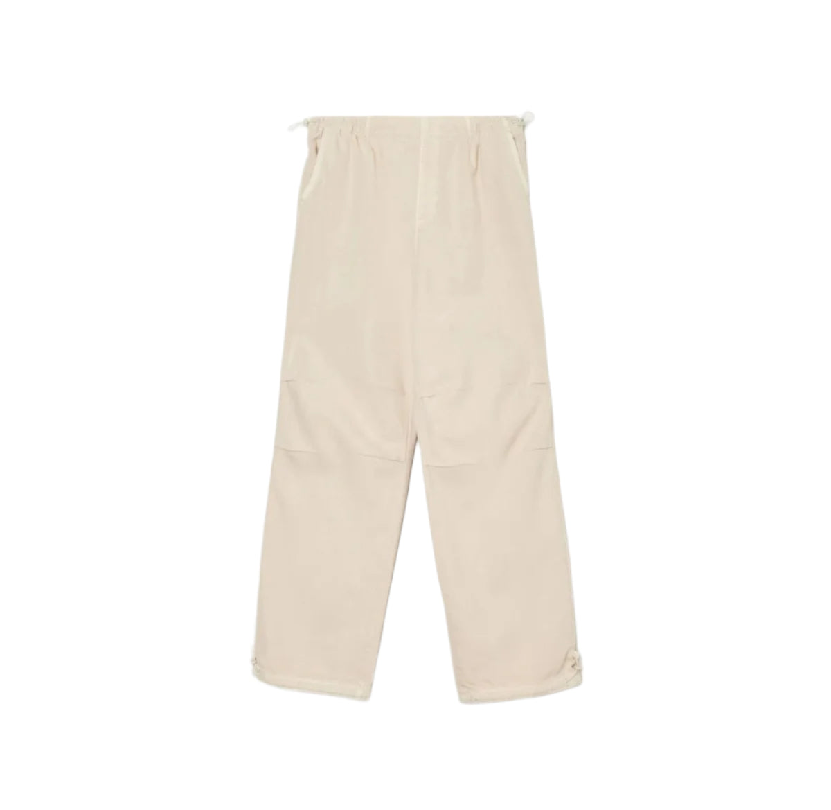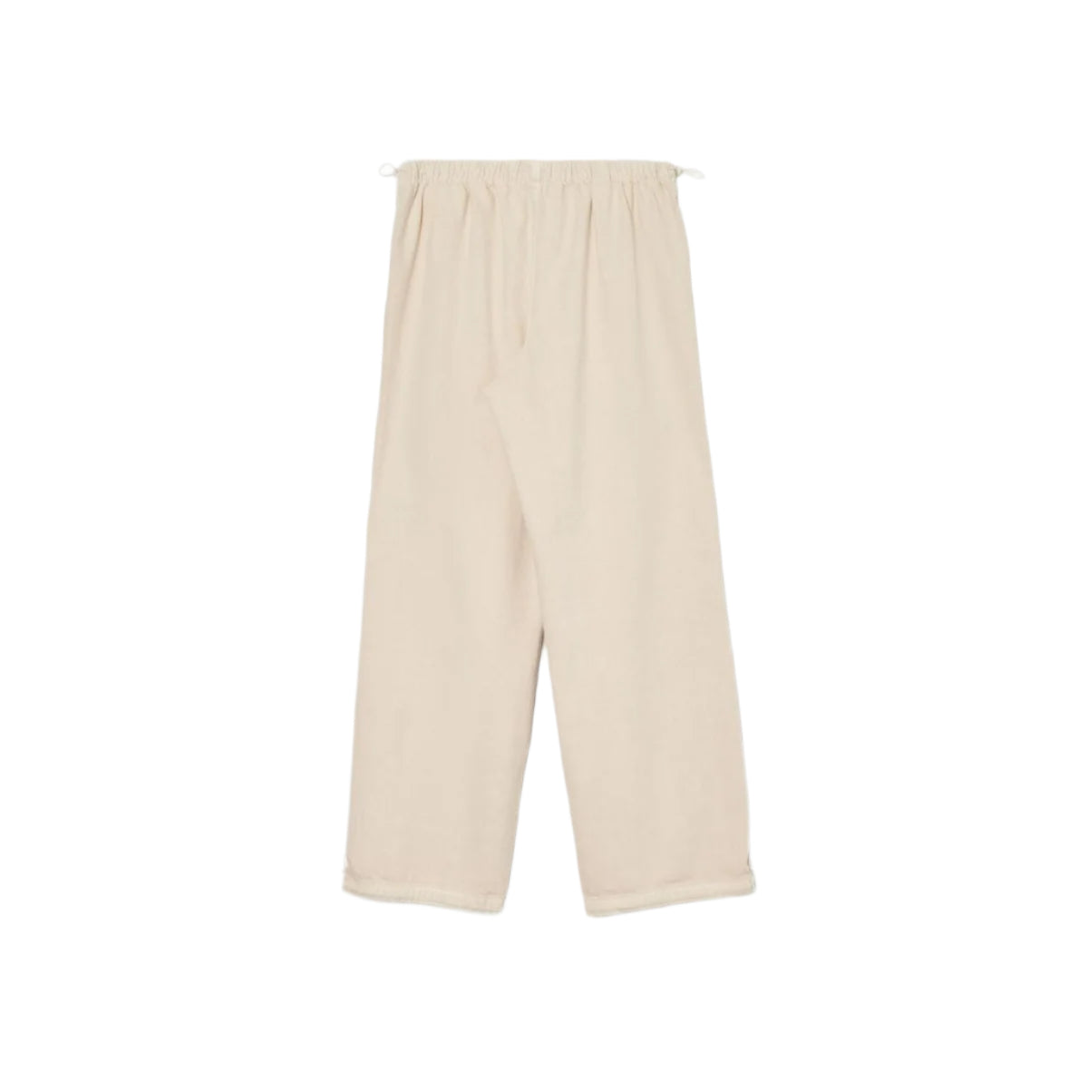 Címke nélküli, női cargo nadrág, bézs színű, gumis húzott derékrésszel, bő szárú fazon, állítható bokarésszel, kényelmes és praktikus viselet hétköznapokra vagy sportos összeállításokhoz.