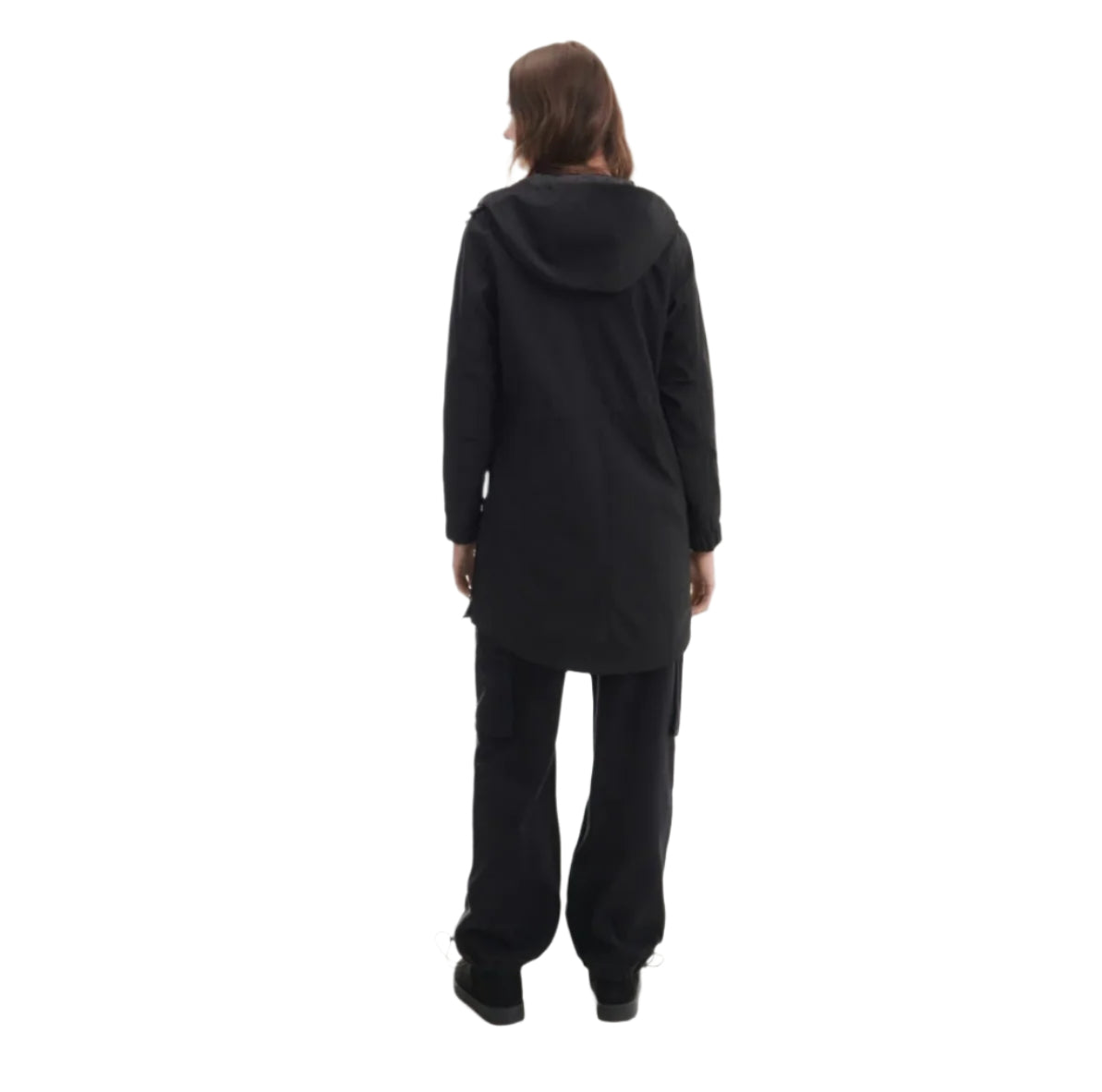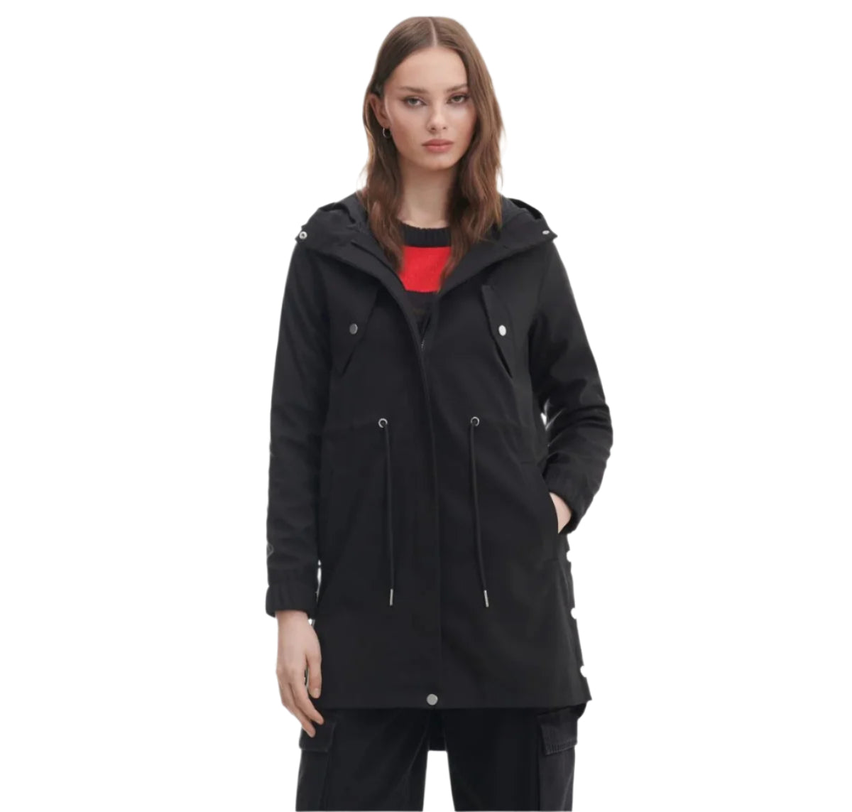Címke nélküli, fekete kapucnis kabát. Vízlepergető anyagból készült, így ideális esős és szeles időjárásra. Húzózsinórral állítható derékrész biztosítja a testhezálló illeszkedést. Cipzárral és patentokkal záródik, oldalán és mellrészén zsebekkel ellátva. Kapucnis kialakítása védelmet nyújt a hűvös időben. Tökéletes választás hétköznapi viseletként és réteges öltözködéshez.