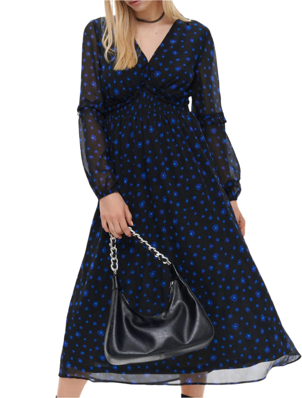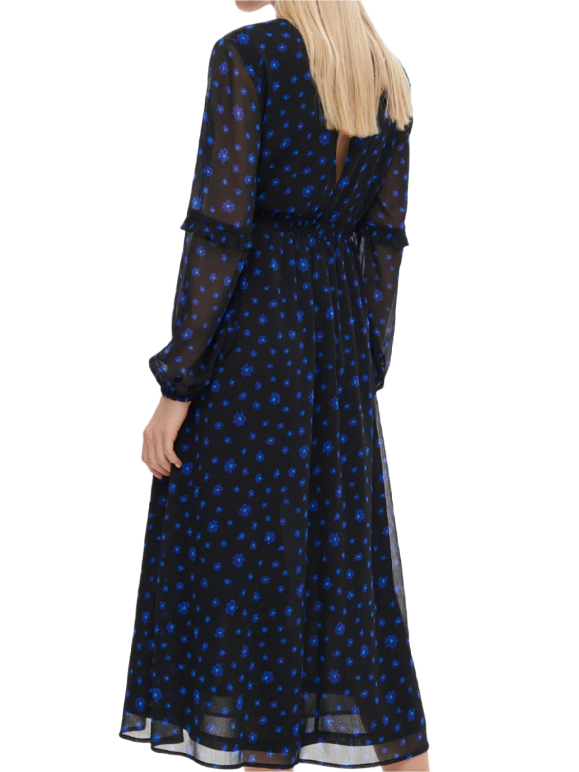 Címke nélküli, női midi ruha, fekete alapon kék apró virágmintával, hosszú ujjú, V-kivágású, enyhén átlátszó ujjak, derékhangsúlyos szabással, elegáns és nőies viselet hétköznapi vagy alkalmi megjelenéshez.