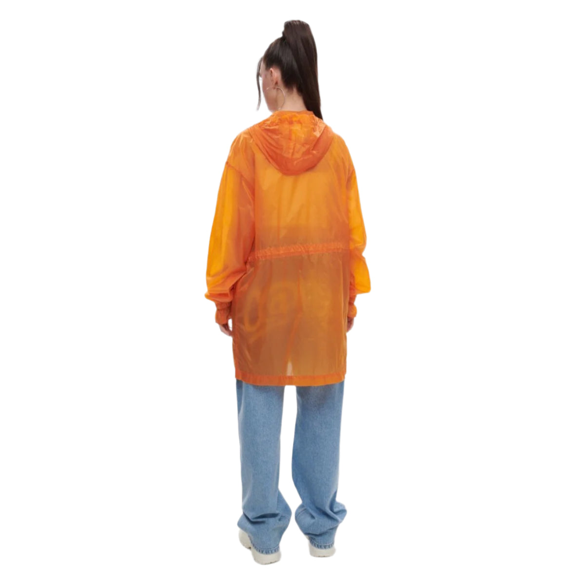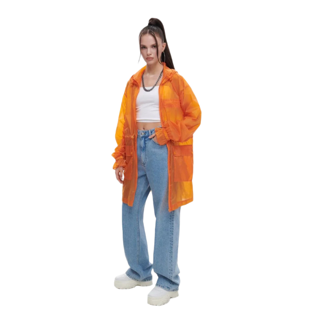 Címke nélküli, narancssárga áttetsző kabát. Könnyű, laza fazonú, kapucnival és cipzárral ellátott dizájn, amely tökéletes kiegészítője a modern, streetwear stílusnak. Hosszított fazonjának köszönhetően extra védelmet nyújt a szél és az enyhe eső ellen. Két praktikus zsebbel rendelkezik az elülső részen. Ideális választás fesztiválokra, városi sétákhoz vagy egyedi megjelenéshez.