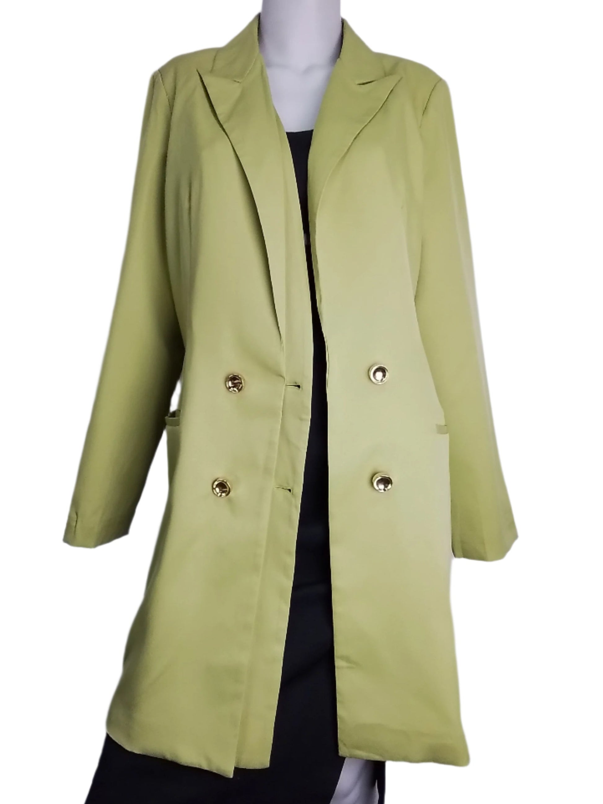 Címke nélküli, elegáns hosszított fazonú blézer, klasszikus gallérral és kétsoros aranygombos záródással. Két oldalsó zsebbel ellátva, könnyed anyagból készült, amely tökéletes választás formális és alkalmi öltözékhez egyaránt.