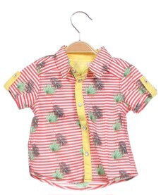 Címke nélküli, rövid ujjú, puha pamut anyagú babaing. Piros-fehér csíkos alapmintával és zöld ananászmintákkal díszített. Elöl sárga gombolópánt, kontrasztos sárga hajtókák az ujjakon. Kényelmes, mégis stílusos darab kisfiúk számára nyári napokra.