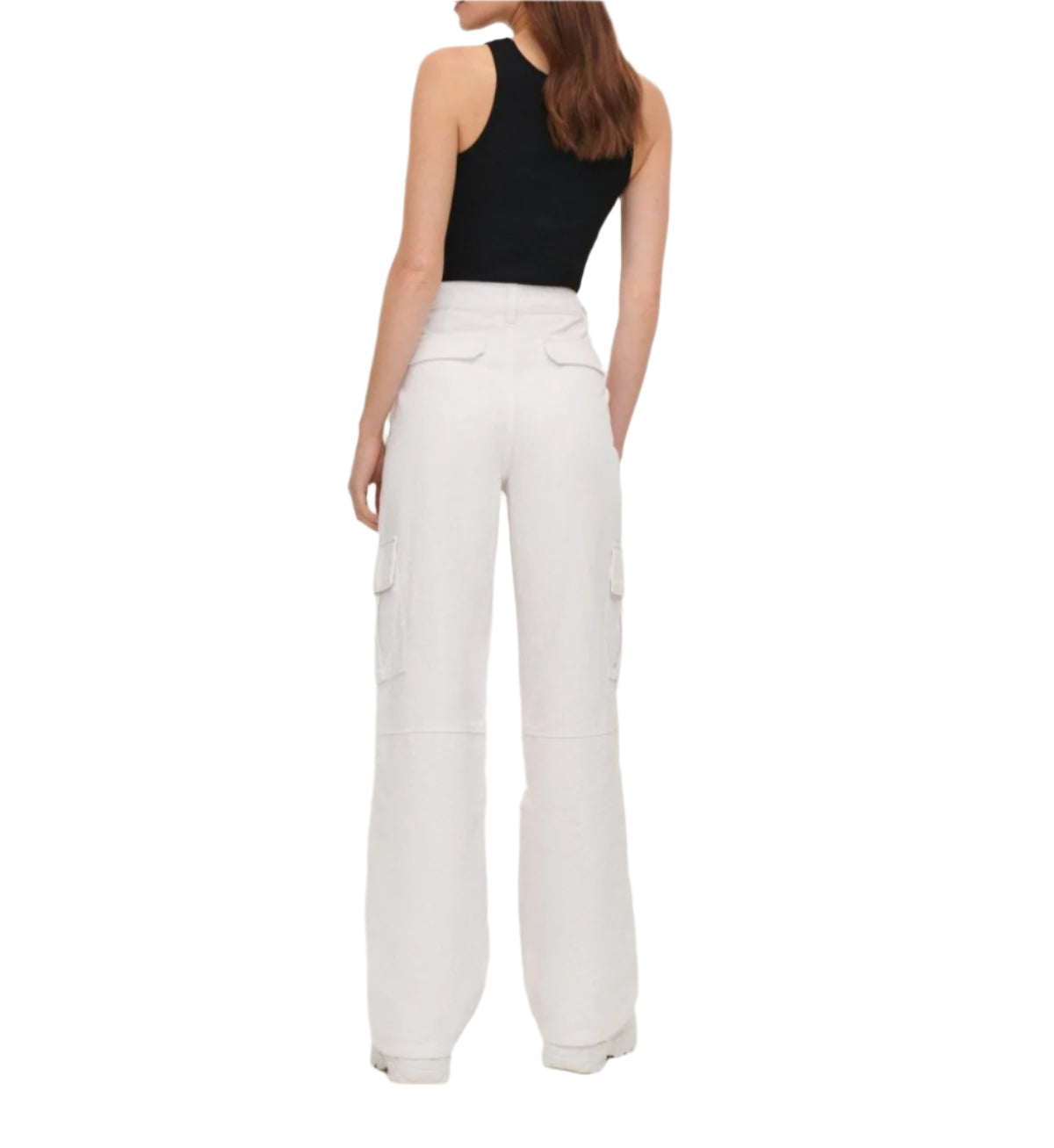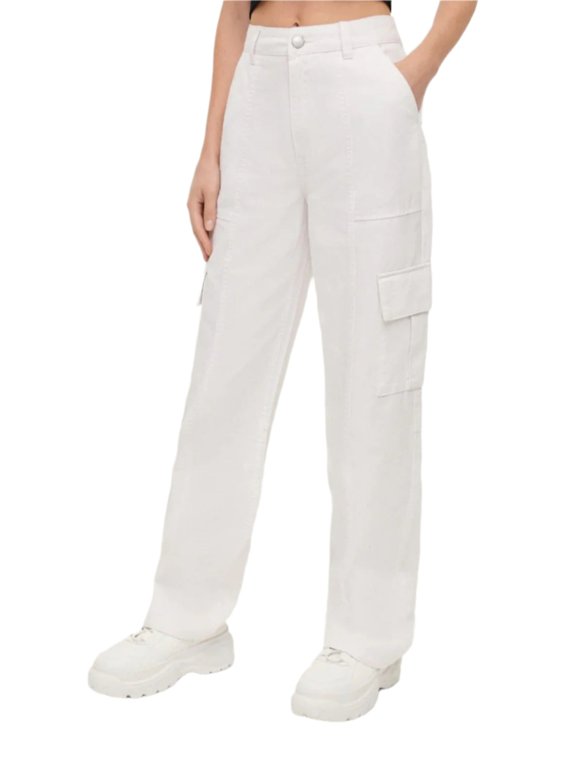 Címke nélküli, női cargo nadrág, fehér színű, magas derekú, bő szárú fazon, oldalzsebekkel, gombos és cipzáras záródással, kényelmes és trendi választás a hétköznapokra.