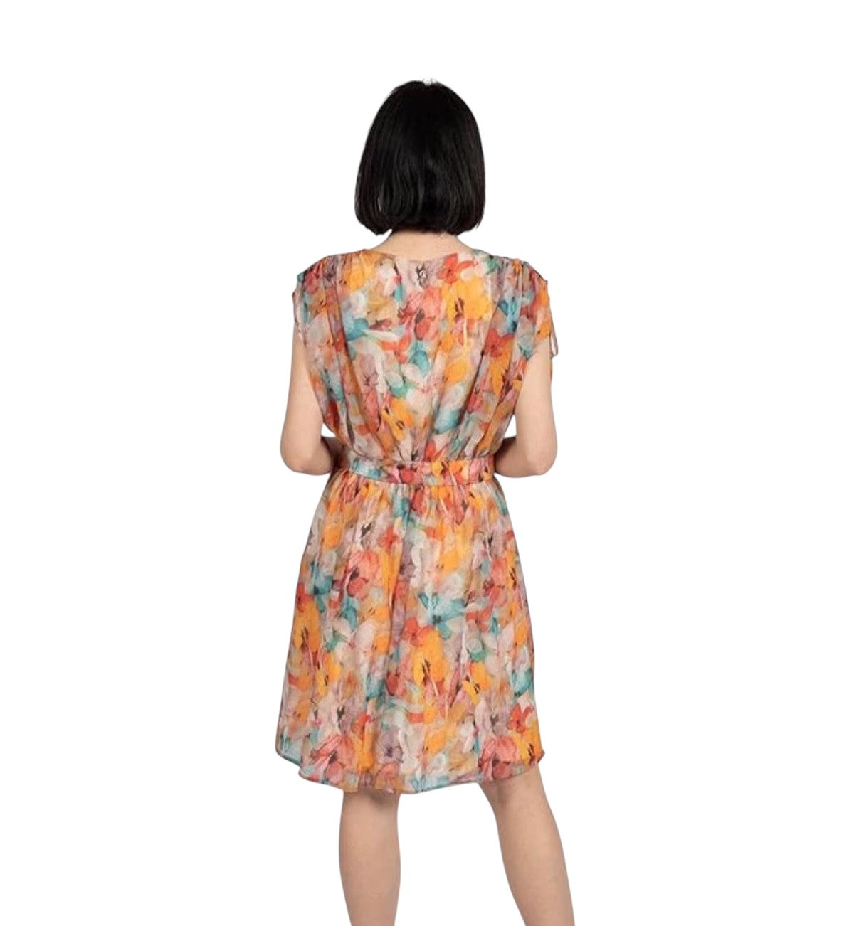 Címke nélküli, többszínű (narancs, sárga, türkiz, rózsaszín) absztrakt virágminta, sifon/könnyű áttetsző szövet, laza, A-vonalú fazon, mély V-nyakkivágás, rövid, bő denevérujjak, széles, hangsúlyos derékrész.