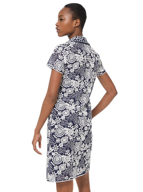 Címke nélküli, sötétkék alapon fehér virágos hímzés, texturált pamutszövet, testhezálló pólóruha fazon, rövid ujjú, galléros, gombos nyakrész, kontrasztos fehér hullámos szegélyek az ujjakon és az alján.