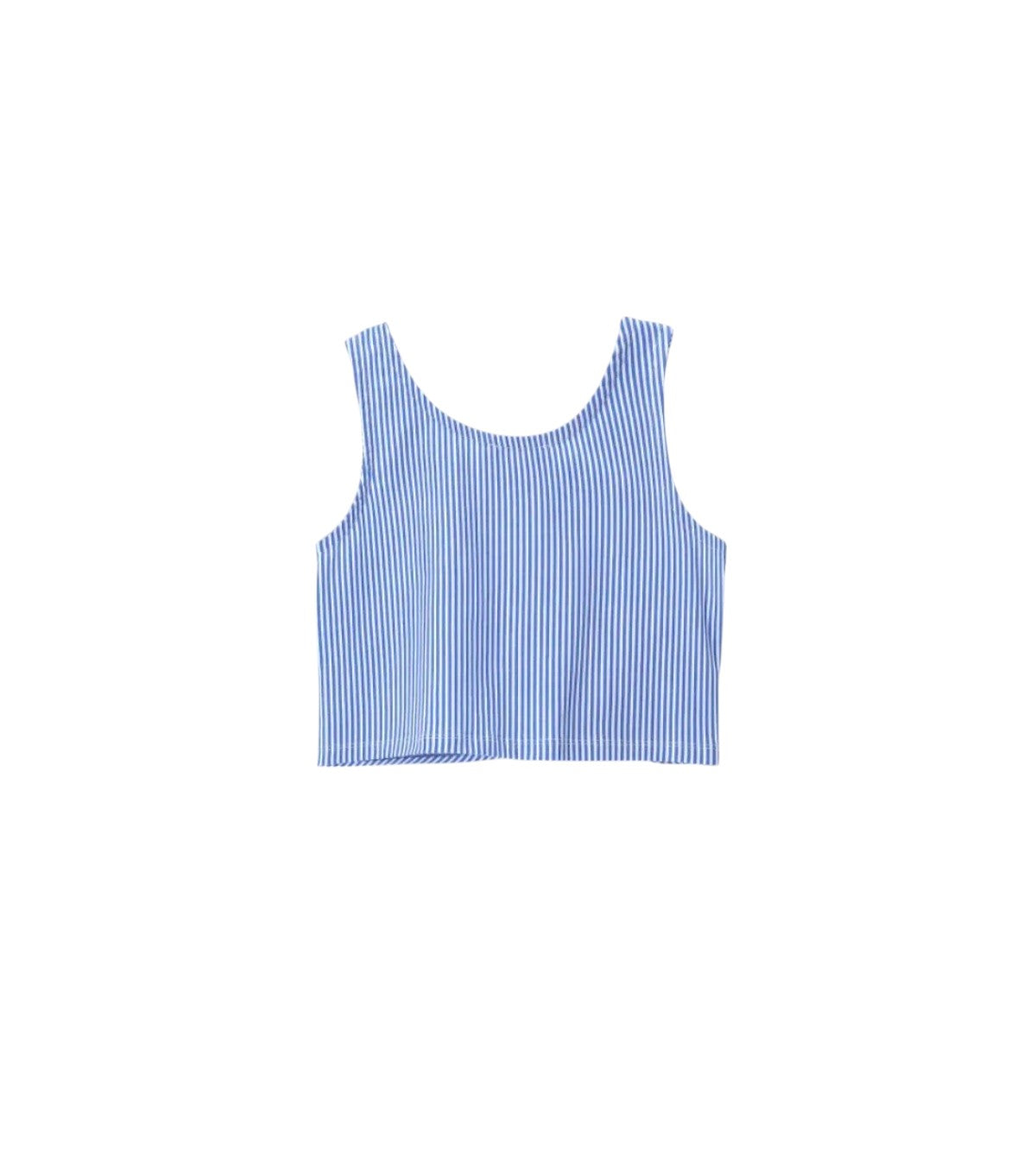 Címke nélküli, kék és fehér csíkos, pamut/szövet, crop top fazon, ujjatlan, kerek nyak, elöl megkötős.