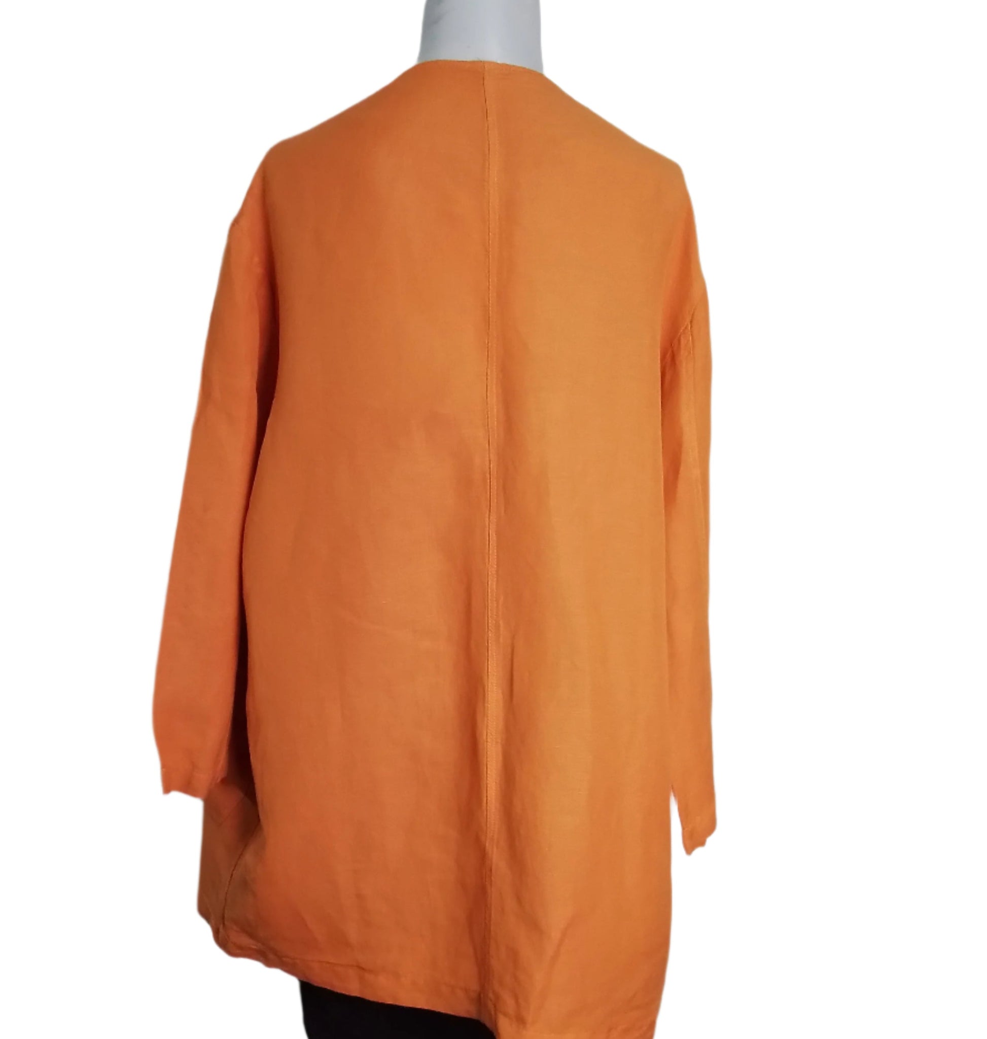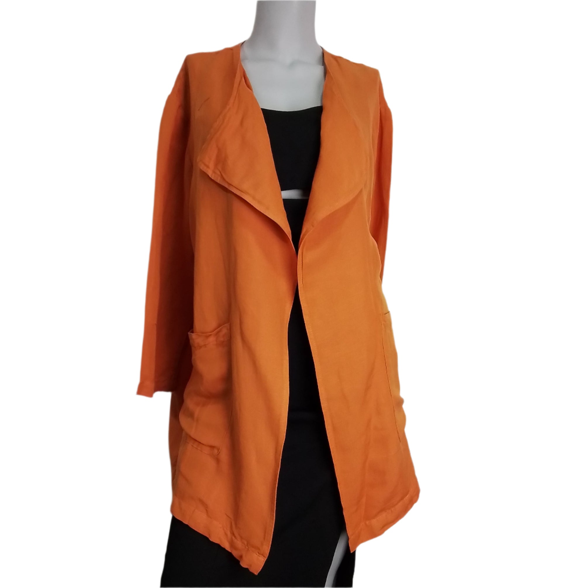 Címke nélküli, könnyed esésű narancssárga blézer, amely kényelmes és lezser megjelenést biztosít. Nyitott fazonjának köszönhetően sokoldalúan kombinálható, míg az oldalzsebek praktikus kiegészítést nyújtanak. Háromnegyedes ujjhossza és puha anyaga ideális választás mindennapi viseletre.