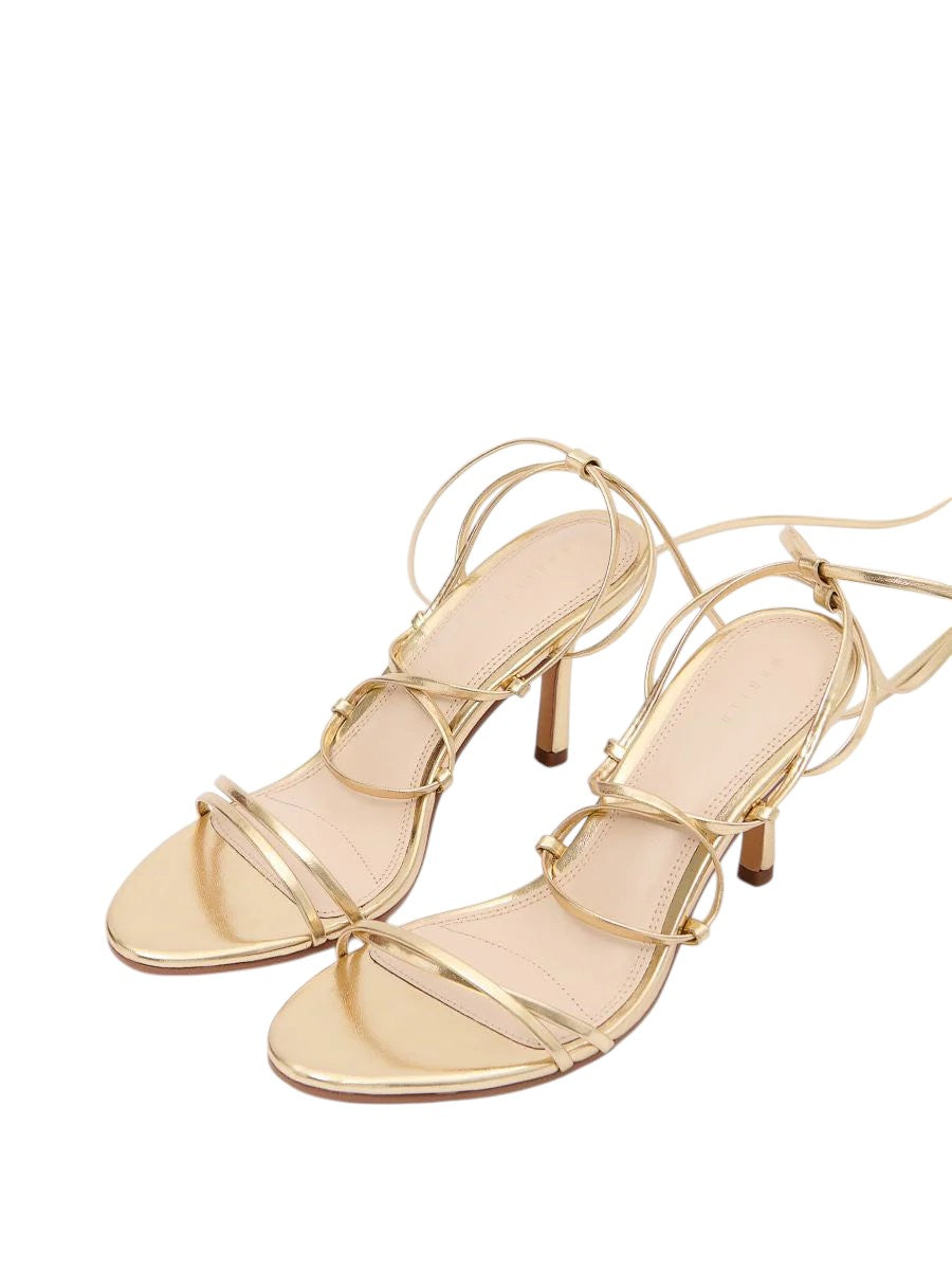Címke nélküli, arany, fémes szintetikus bőr, pántos szandál fazon, nyitott, szögletes orr, több vékony pánt a lábfejen, bokánál megkötős pánt, vékony (stiletto) sarok. Belső talp hossz: 26cm