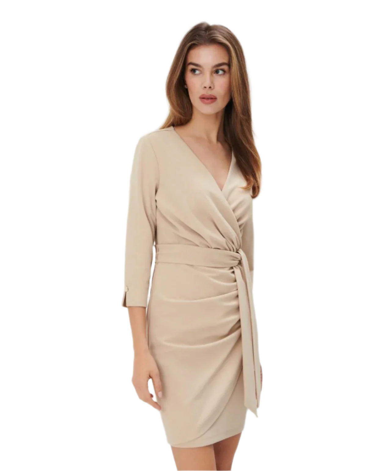 Címke nélküli, női mini ruha, bézs színű, V-kivágású, átlapolt fazon, deréknál megkötős, háromnegyedes ujjú gombos díszítéssel, elegáns és nőies viselet alkalmakra vagy üzleti megjelenéshez.