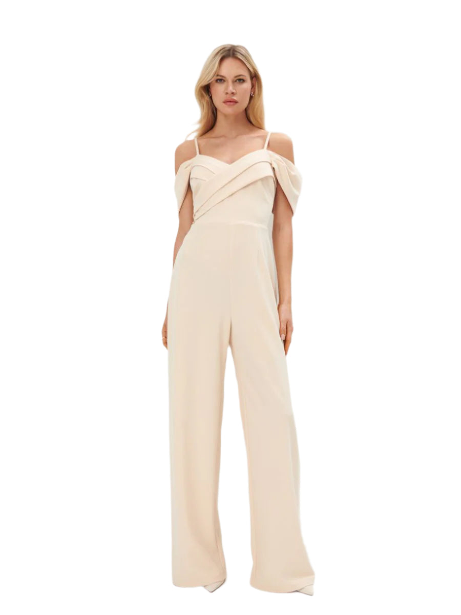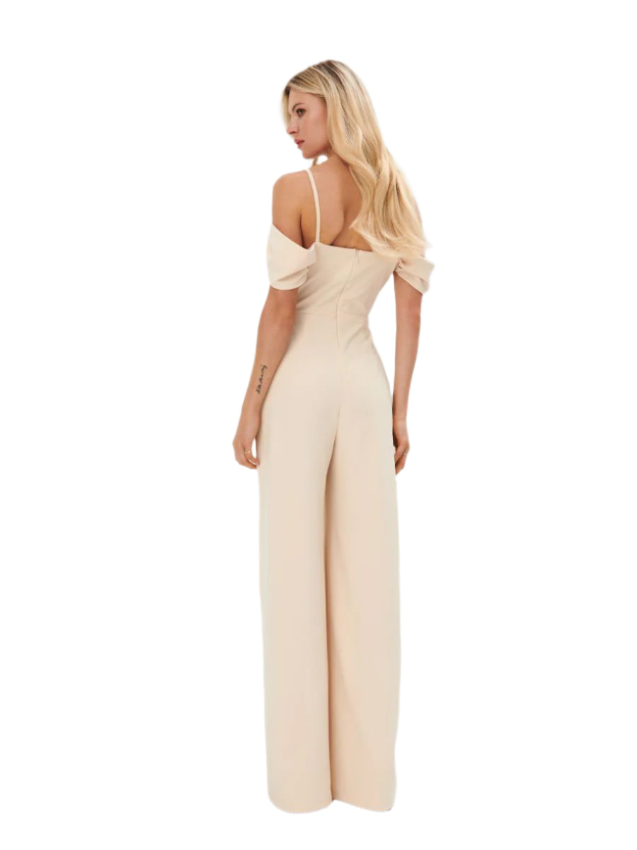 Címke nélküli, bézs színű, elegáns overál vékony pántokkal és vállat szabadon hagyó kialakítással. A felső részen átlapolt dizájn és finom redőzések teszik különlegessé. Magasan szabott derékrész és bő szárú nadrág fazon biztosítja az elegáns megjelenést. Tökéletes választás alkalmi eseményekre.
