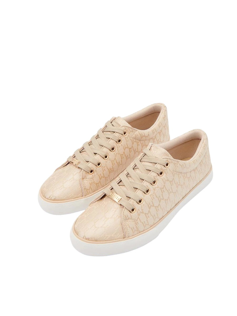 Címke nélküli, bézs, textil, tornacipő fazon, fűzős, arany színű fűzőlyukak és fűzővég dísz, fehér gumitalp. Belső talp hossz: 22cm