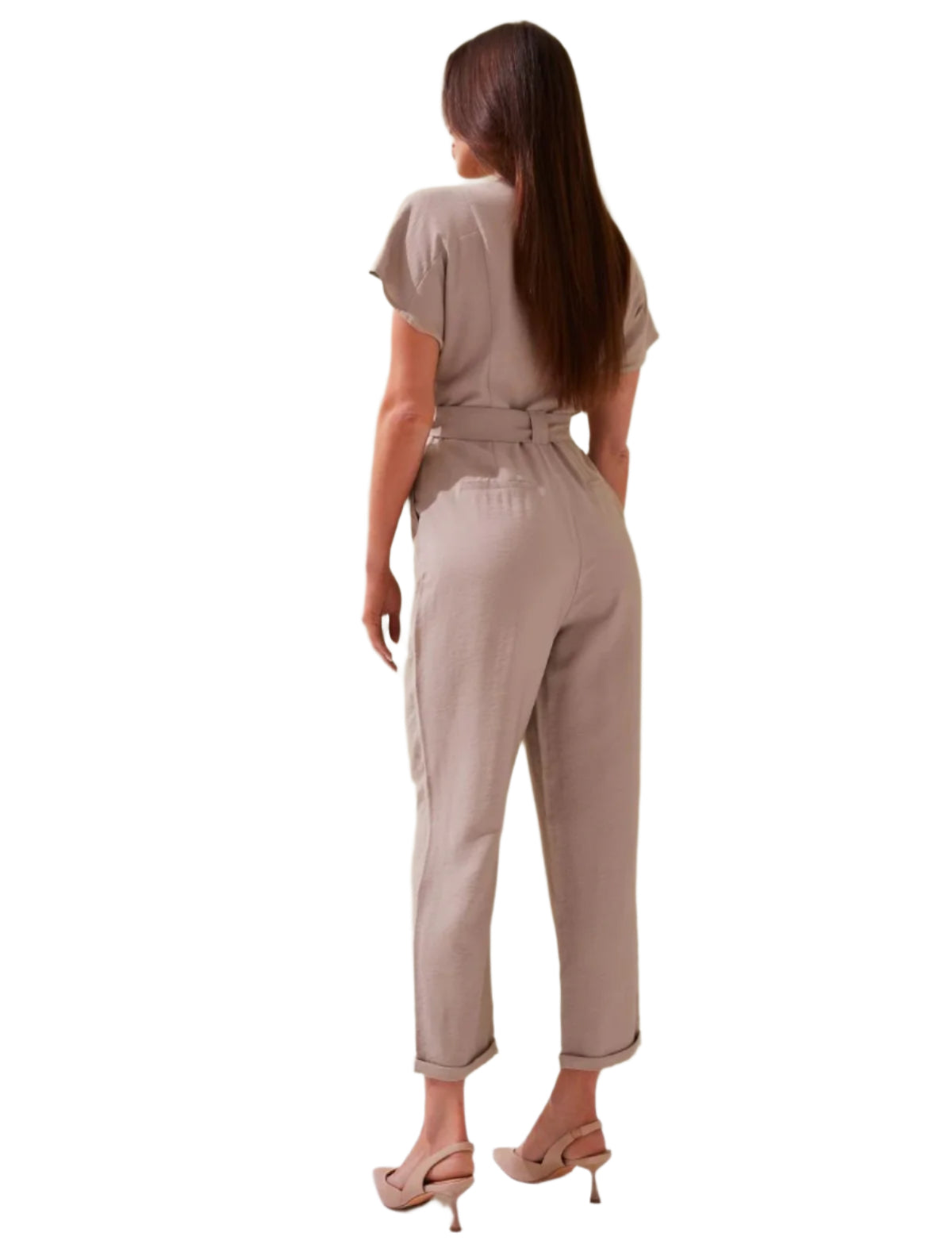 Címke nélküli, bézs színű, rövid ujjú overál elegáns gallérral és gombos előlappal. Derékban megkötős övvel hangsúlyozható az alak, míg az egyenes szabású, visszahajtott szárú nadrágrész modern megjelenést biztosít. Kényelmes és stílusos választás mindennapi viseletre vagy alkalmi megjelenéshez.