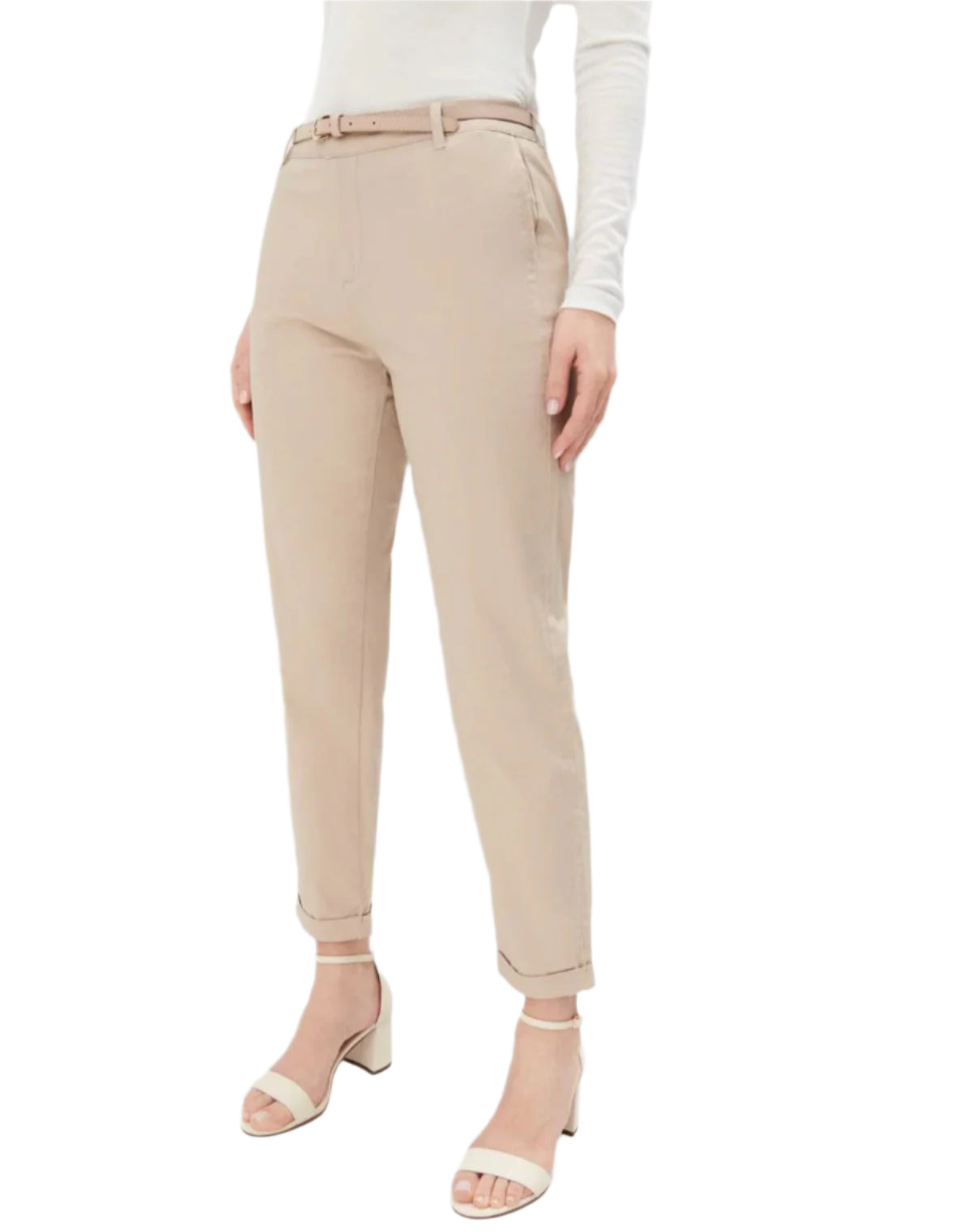 Címke nélküli, női chino nadrág, bézs színű, magas derekú, szűkített szárú fazon, visszahajtott szárvégekkel, övbújtatós kialakítással és hozzáillő vékony övvel, letisztult és elegáns viselet irodai vagy hétköznapi outfitekhez.