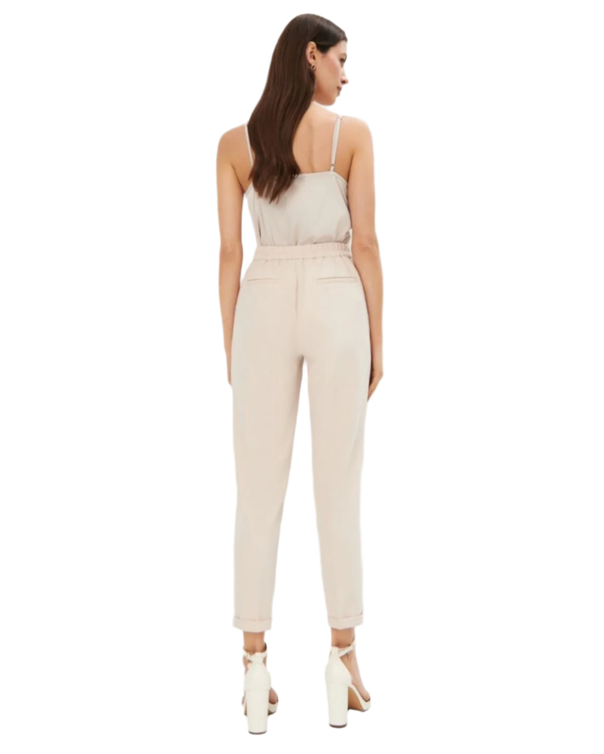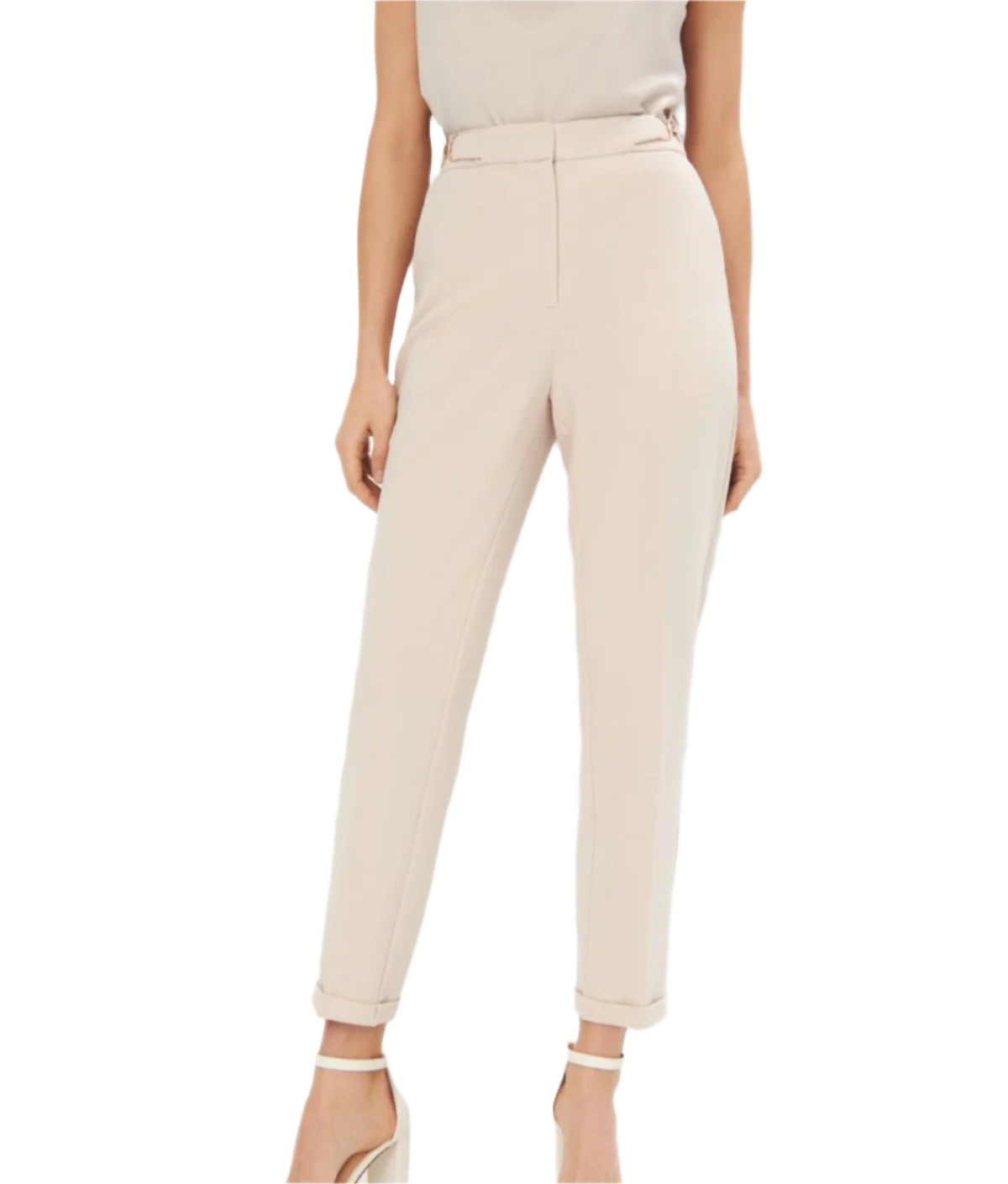 Címke nélküli, női elegáns nadrág, bézs színű, magas derekú, szűkített szárú fazon, visszahajtott szárvégekkel, díszes fém részletekkel az övrészen, letisztult és kifinomult megjelenés, tökéletes irodai vagy alkalmi viselethez.