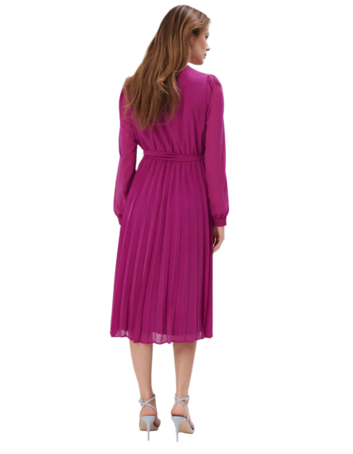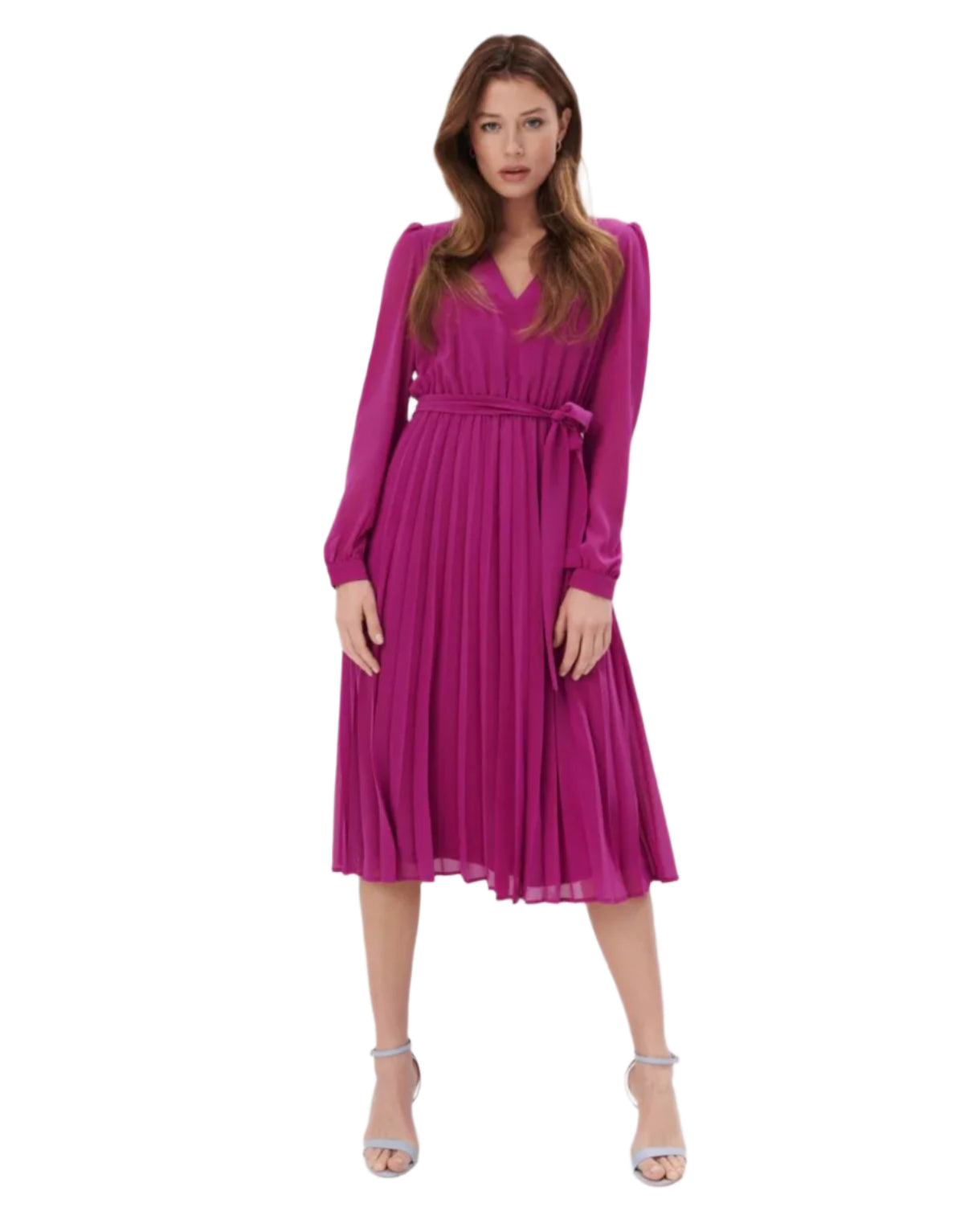 Címke nélküli, elegáns bíbor midi ruha. Könnyed, légies anyagból készült, amely kényelmes viseletet biztosít. V-kivágású dekoltázsa és hosszú ujjai nőies megjelenést kölcsönöznek. Rakott szoknyarésze és a deréknál megkötős rész hangsúlyozza az alakot. Ideális választás alkalmi eseményekre, vacsorára vagy munkahelyi viseletként is.