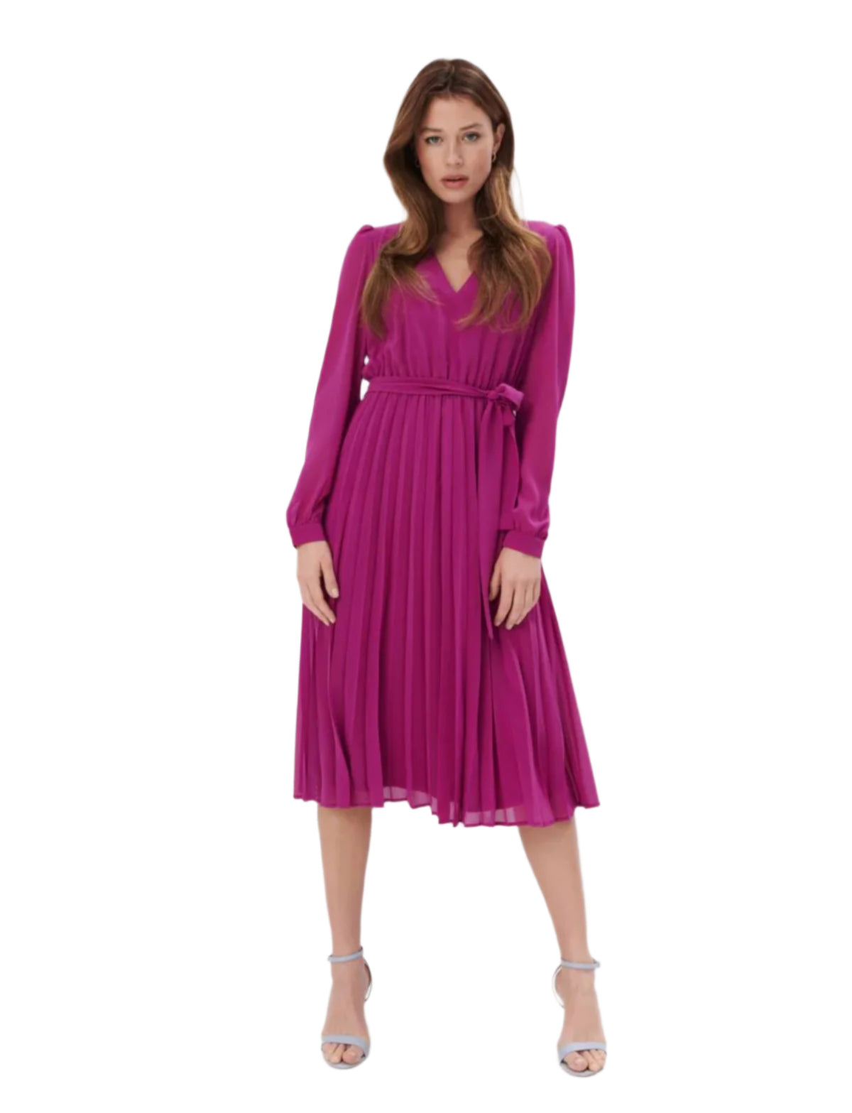 Címke nélküli, női midi ruha, ciklámen színű, V-kivágású, hosszú ujjú, derékhangsúlyos fazon megkötővel, pliszírozott szoknyarésszel, elegáns és nőies viselet alkalmakra vagy elegáns hétköznapi megjelenéshez.