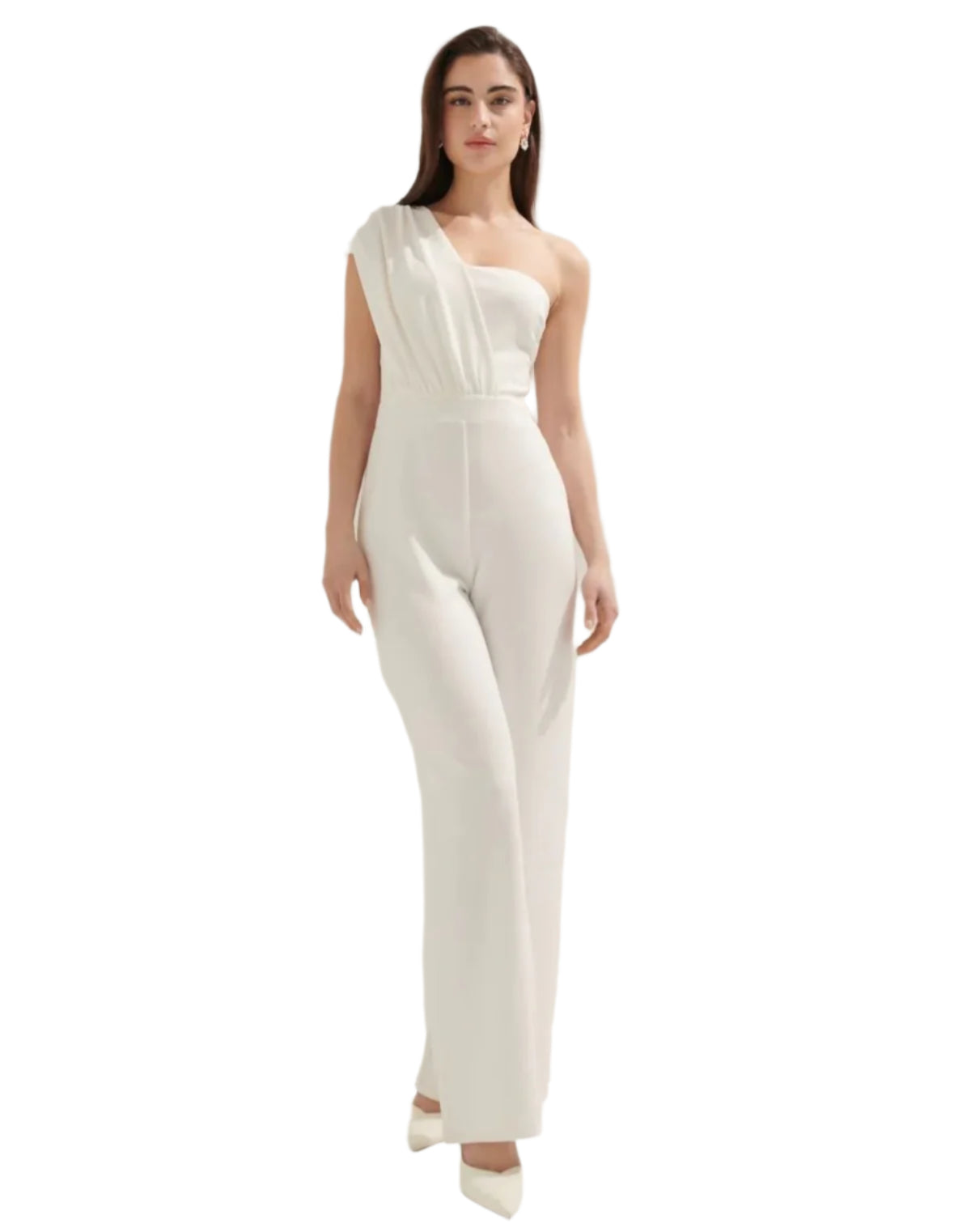 Címke nélküli, ekrü színű, aszimmetrikus vállú ruha, amely elegáns és kifinomult megjelenést kölcsönöz. Egyik vállán pliszírozott redőzés díszíti, míg a másik váll szabadon hagyott. Derékrésze karcsúsított, az egyenes szabású nadrágszárak pedig nyújtják az alakot. Tökéletes választás alkalmi eseményekre, elegáns rendezvényekre vagy különleges megjelenéshez.