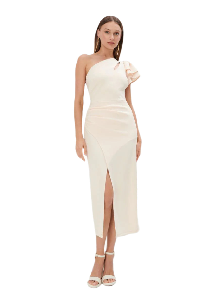 Címke nélküli, elegáns ekrü színű aszimmetrikus midi ruha fodros vállrésszel és oldalslicceléssel. Testhez simuló szabásának és nőies kialakításának köszönhetően tökéletes választás alkalmi eseményekre, esküvőkre vagy elegáns vacsorákra.