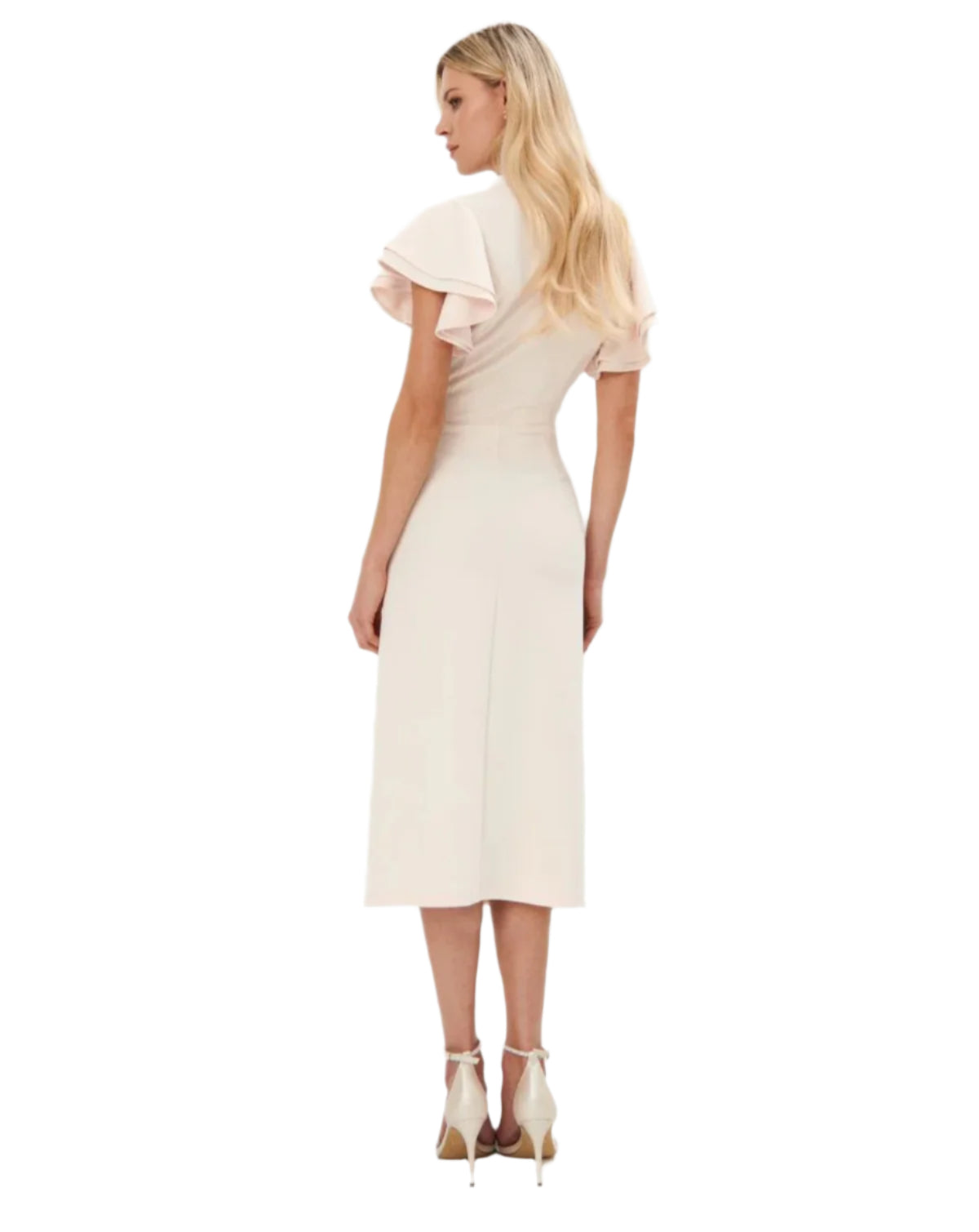 Címke nélküli, elegáns ekrü midi ruha romantikus fodros ujjakkal és karcsúsító, húzott derékrésszel. V-kivágású nyakkal és oldalslicceléssel rendelkezik, amely nőies megjelenést biztosít. Ideális alkalmi vagy elegáns eseményekre.