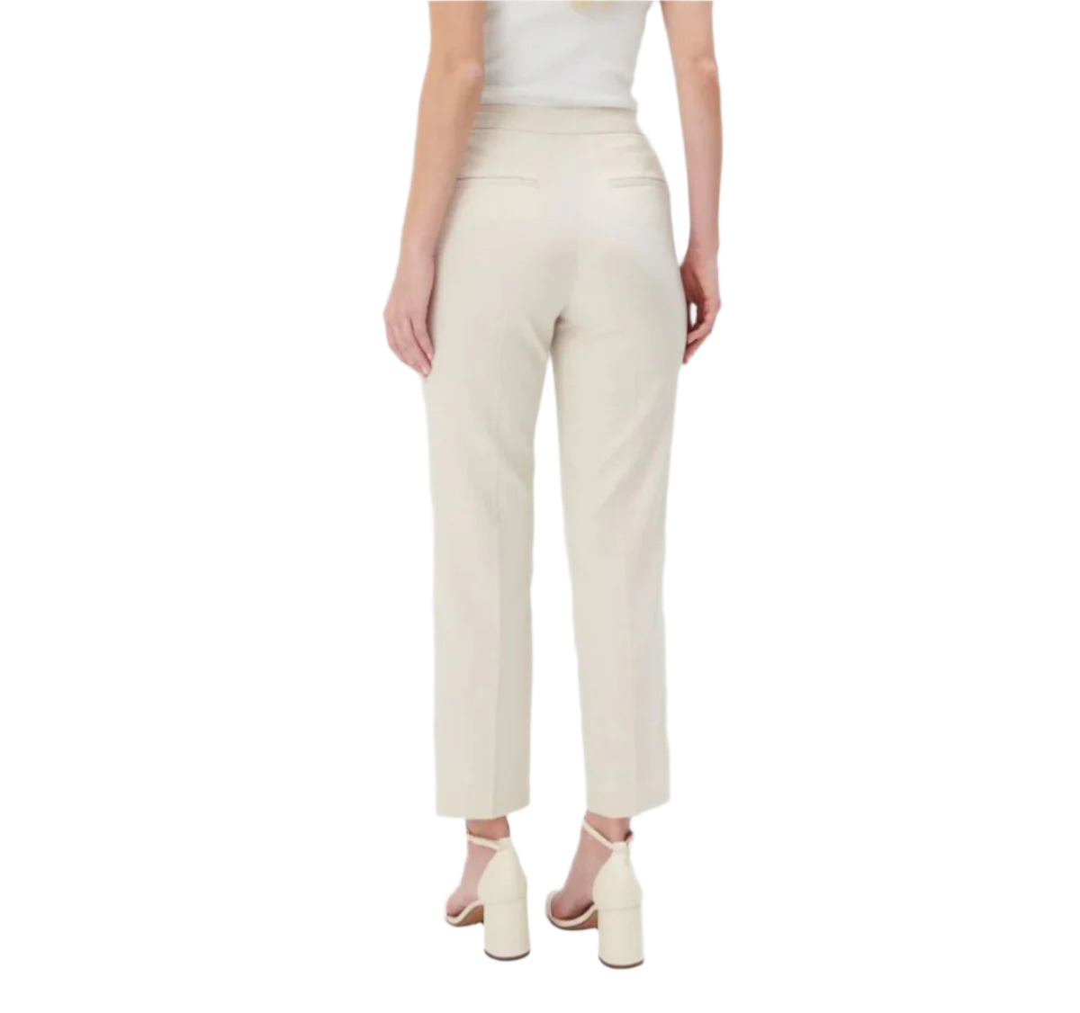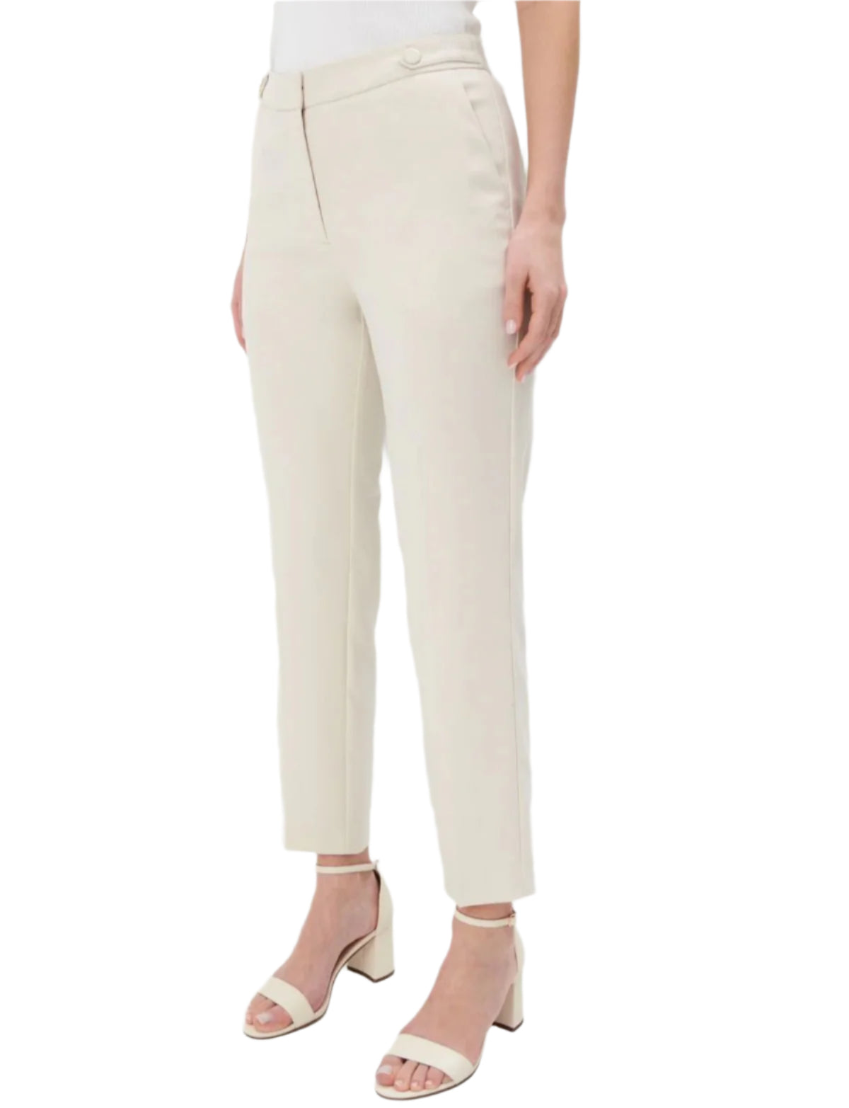 Címke nélküli, női elegáns nadrág, ekrü színű, magas derekú, szűkített szárú fazon, gombos részletekkel az oldalsó derékrészen, cipzáras záródással, kifinomult és stílusos viselet irodai vagy alkalmi megjelenéshez.