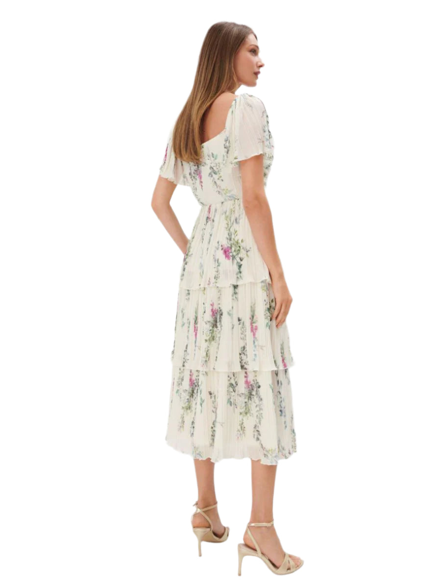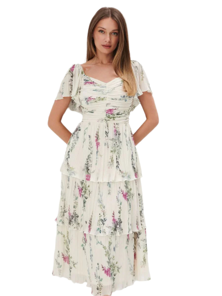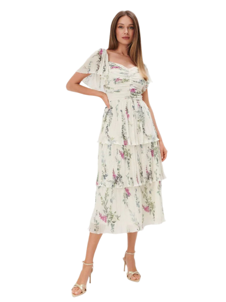 Címke nélküli, romantikus ekrü alapszínű midi ruha finom virágmintával. Lágyan redőzött, réteges szoknyarészének köszönhetően légies és nőies megjelenést biztosít. Szív alakú dekoltázsa és rövid, átlátszó ujja kiemeli a nőies vonalakat. Tökéletes választás elegáns eseményekre, nyári sétákhoz vagy romantikus vacsorákhoz.