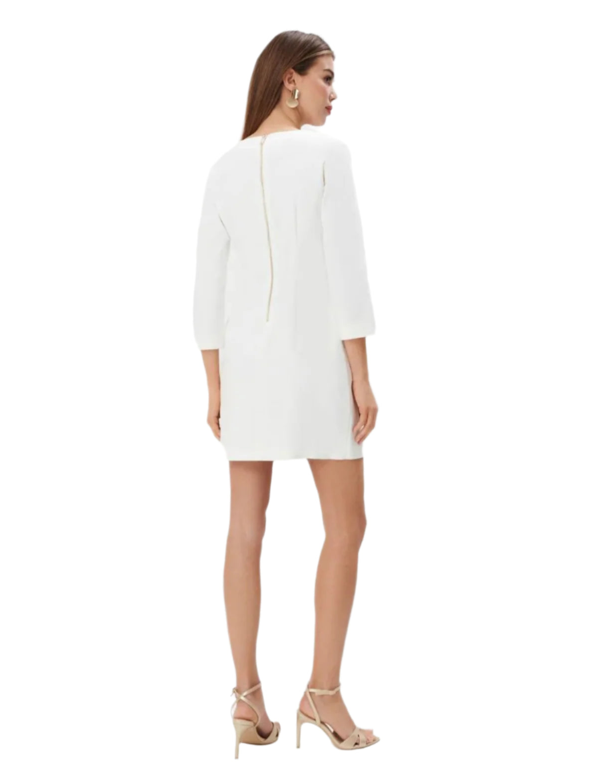 Címke nélküli, elegáns fehér miniruha aszimmetrikus gombos záródással. Háromnegyedes ujjú, V-kivágású nyakkal és enyhén karcsúsított szabással rendelkezik. Letisztult és kifinomult megjelenést biztosít, tökéletes választás alkalmi eseményekre vagy elegáns hétköznapi viseletként.