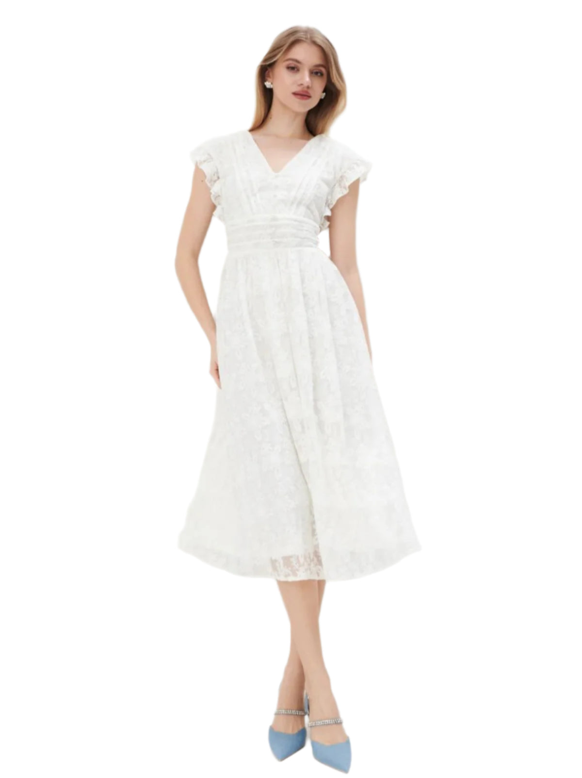 Címke nélküli, női midi ruha, fehér csipkés anyagból, V-kivágású, rövid fodros ujjakkal, derékhangsúlyos szabással, légies és elegáns viselet alkalmakra vagy romantikus megjelenéshez.