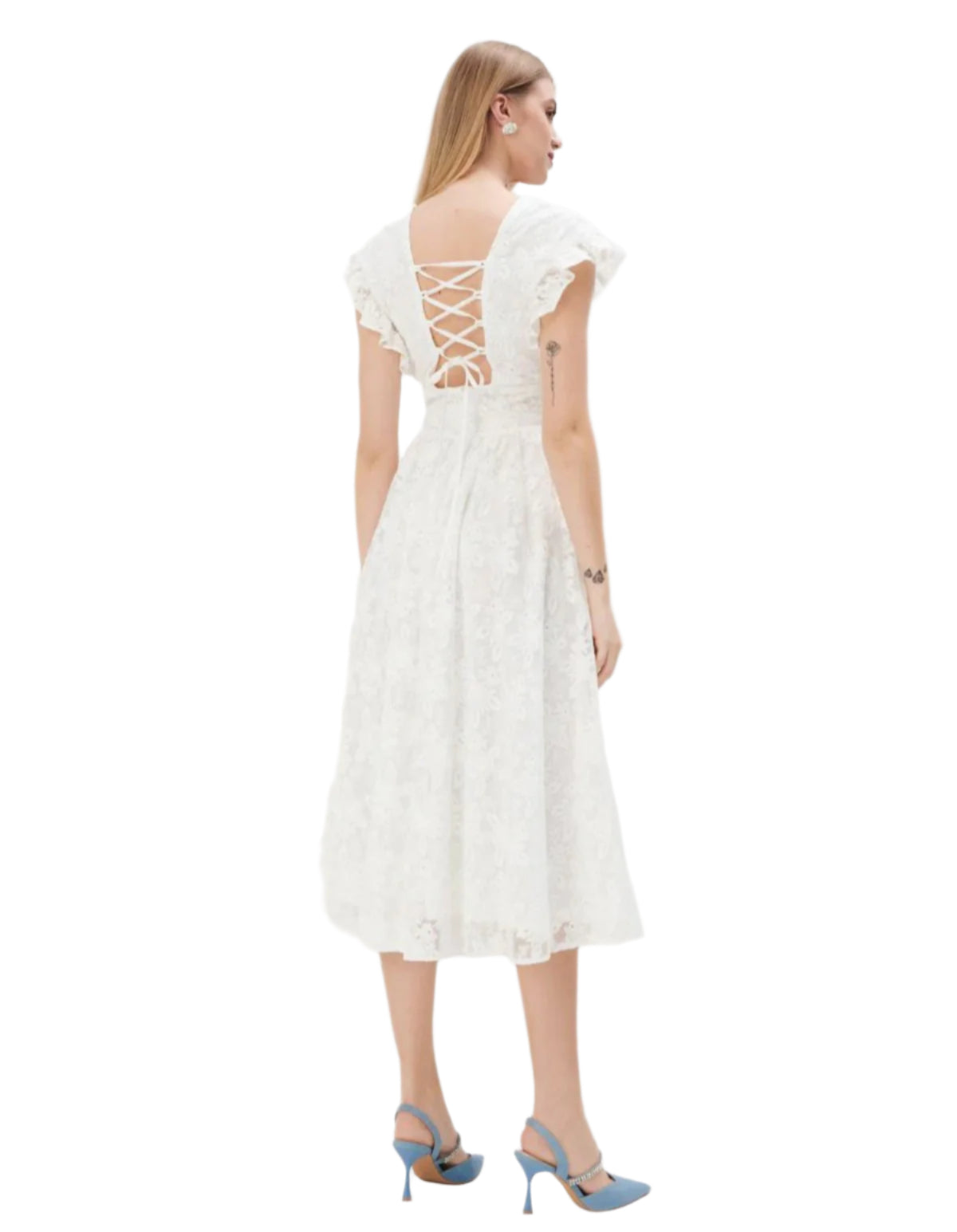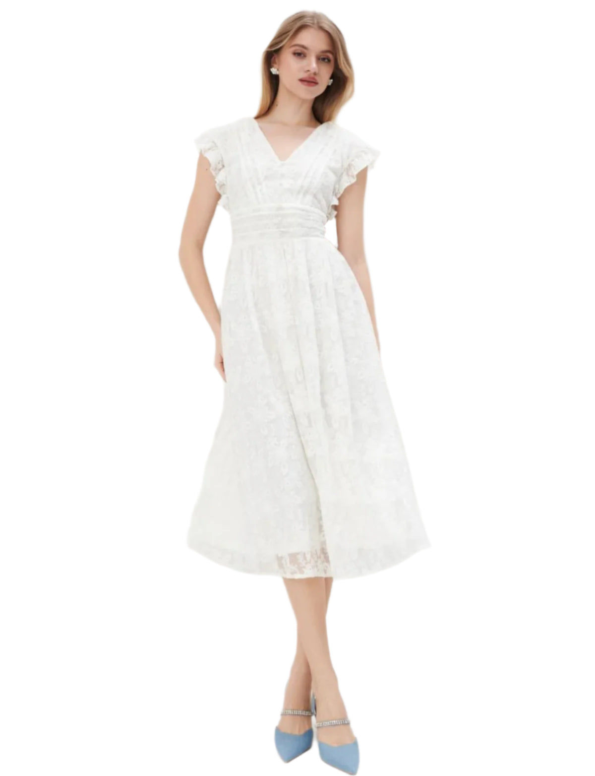Címke nélküli, elegáns fehér midi ruha finom csipkével és romantikus fodros ujjakkal. V-kivágása és karcsúsított derékrésze nőies megjelenést biztosít. Könnyed esésű szoknyarésszel rendelkezik, amely tökéletes választás esküvőkre, elegáns eseményekre vagy nyári alkalmakra.