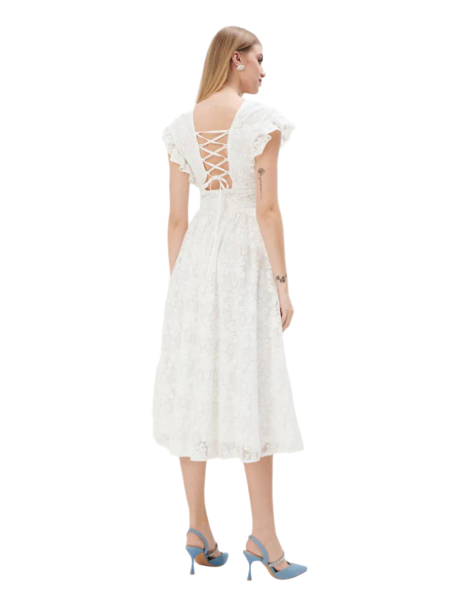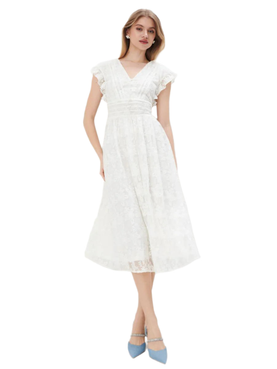Címke nélküli, elegáns fehér midi ruha romantikus csipkés részletekkel. V-kivágású dekoltázs és finom fodros ujjrész teszi nőiessé és kifinomulttá. A derékrészen található ráncolás kiemeli az alakot, míg a könnyed anyag biztosítja a kényelmet és az eleganciát. Ideális választás esküvőre, különleges alkalmakra vagy nyári eseményekre.