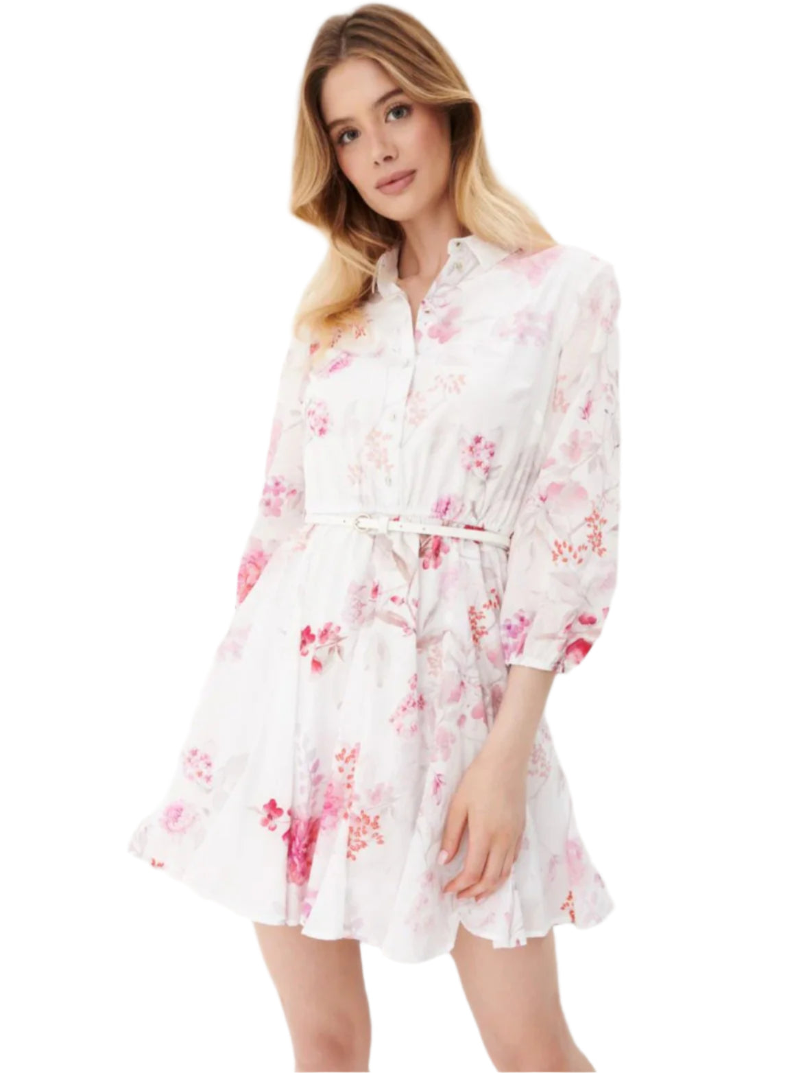 Címke nélküli, romantikus fehér alapú, rózsaszín virágmintás ingruha. Könnyed, légies anyagból készült, amely tökéletes kényelmet biztosít. Hosszú ujjakkal, gombos előlappal és deréknál állítható övvel rendelkezik, amely kiemeli az alakot. A fodros szoknyarész nőies és játékos megjelenést kölcsönöz. Ideális választás tavaszi-nyári alkalmakra, randira vagy akár hétköznapi eleganciára.