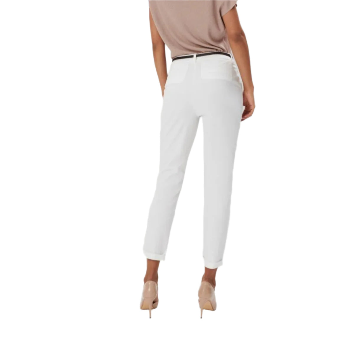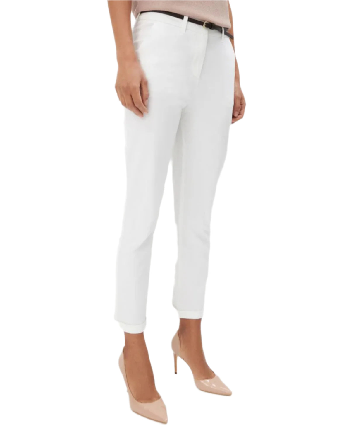 Címke nélküli, női chino nadrág, fehér színű, magas derekú, szűkített szárú fazon, visszahajtott szárvégekkel, övbújtatós kialakítással, letisztult és elegáns viselet irodai vagy hétköznapi outfitekhez.