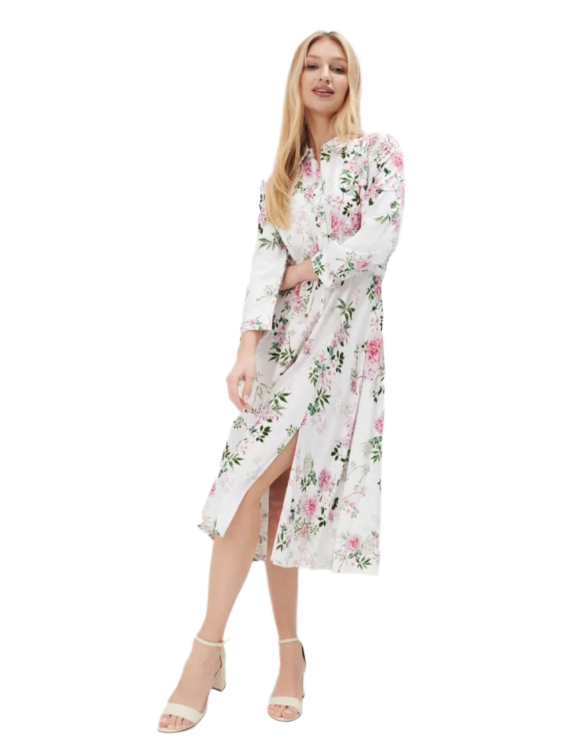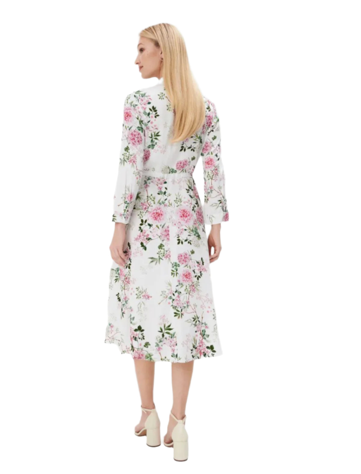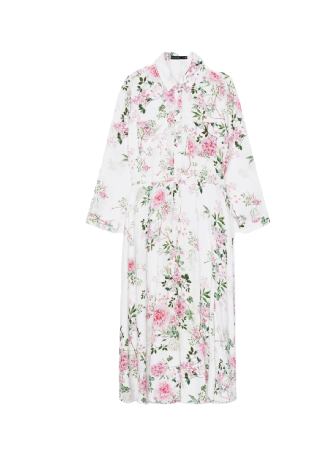Címke nélküli, fehér alapon rózsaszín és zöld virágmintás ingruha. Hosszú ujjú, galléros kialakítás gombos záródással. Derékban megkötős szabás, amely kiemeli az alakot. Kényelmes, légies anyaga tökéletes hétköznapi vagy elegánsabb alkalmakra is.