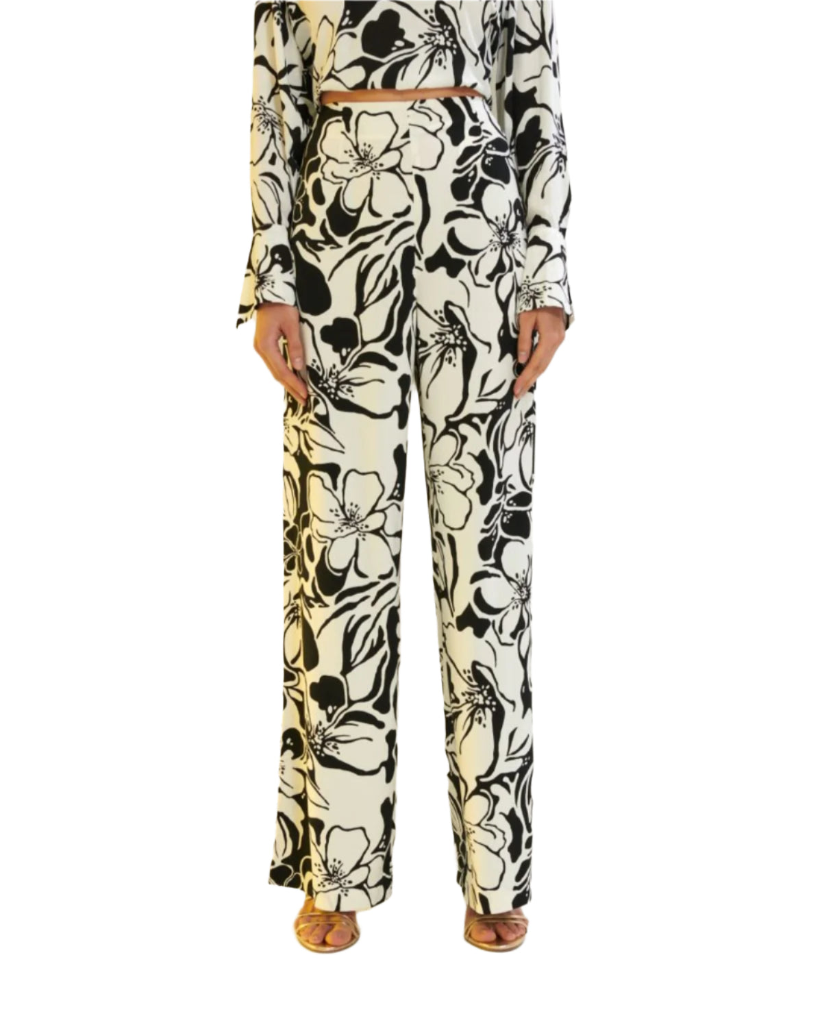 Címke nélküli, fekete-fehér színű nadrág, látványos virágmintás designnal. Bő szárú, magas derekú fazon, amely könnyed és elegáns megjelenést biztosít. Tökéletes választás nyári outfitekhez vagy alkalmi viseletként.