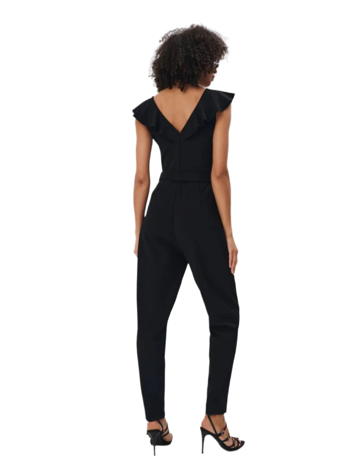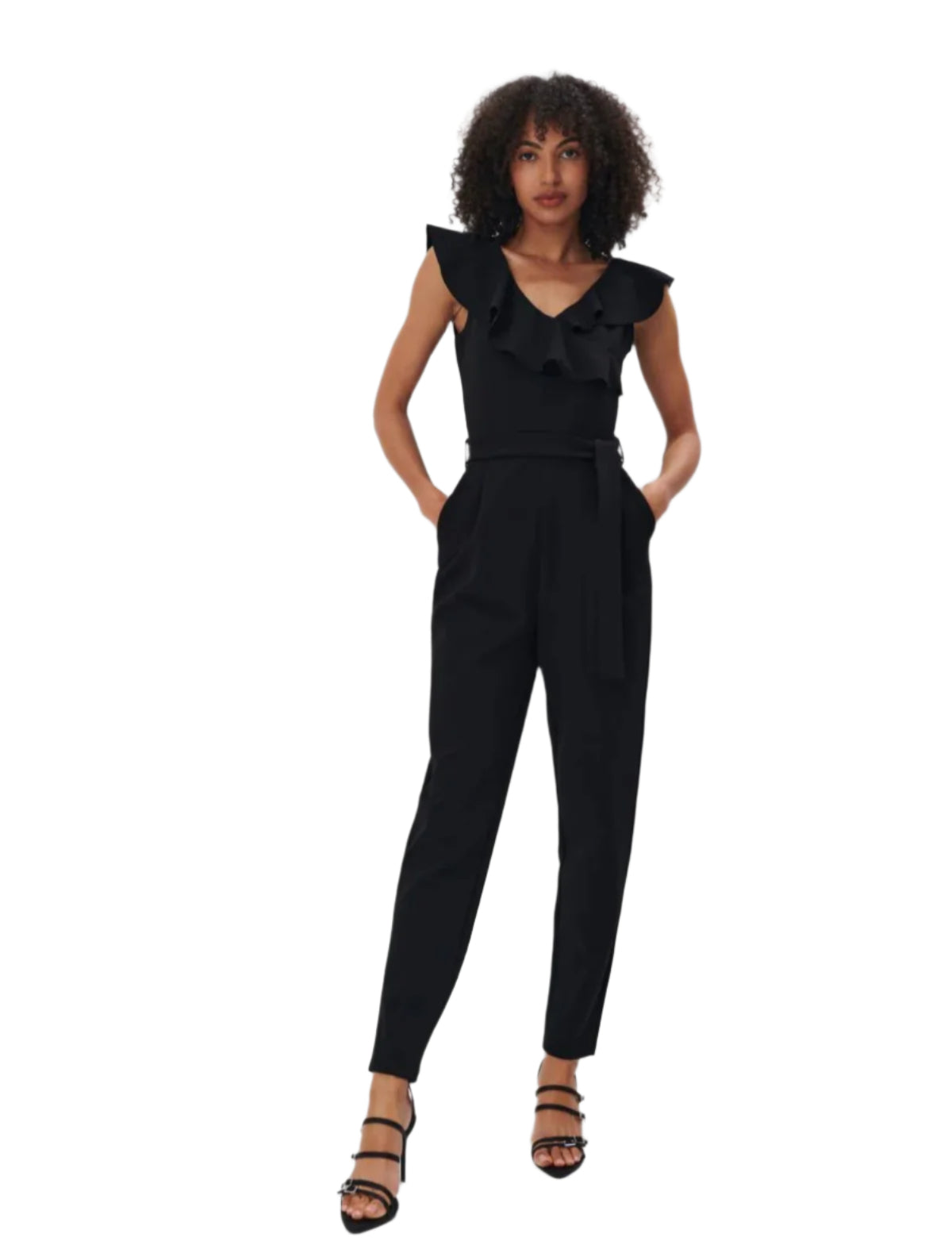 Címke nélküli, női overál, fekete színű, elegáns fodros vállrésszel, V-kivágású felsőrésszel, derékhangsúlyos megkötős övvel, szűkített szárú fazon, kifinomult és nőies viselet alkalmi eseményekre vagy esti megjelenésekhez.