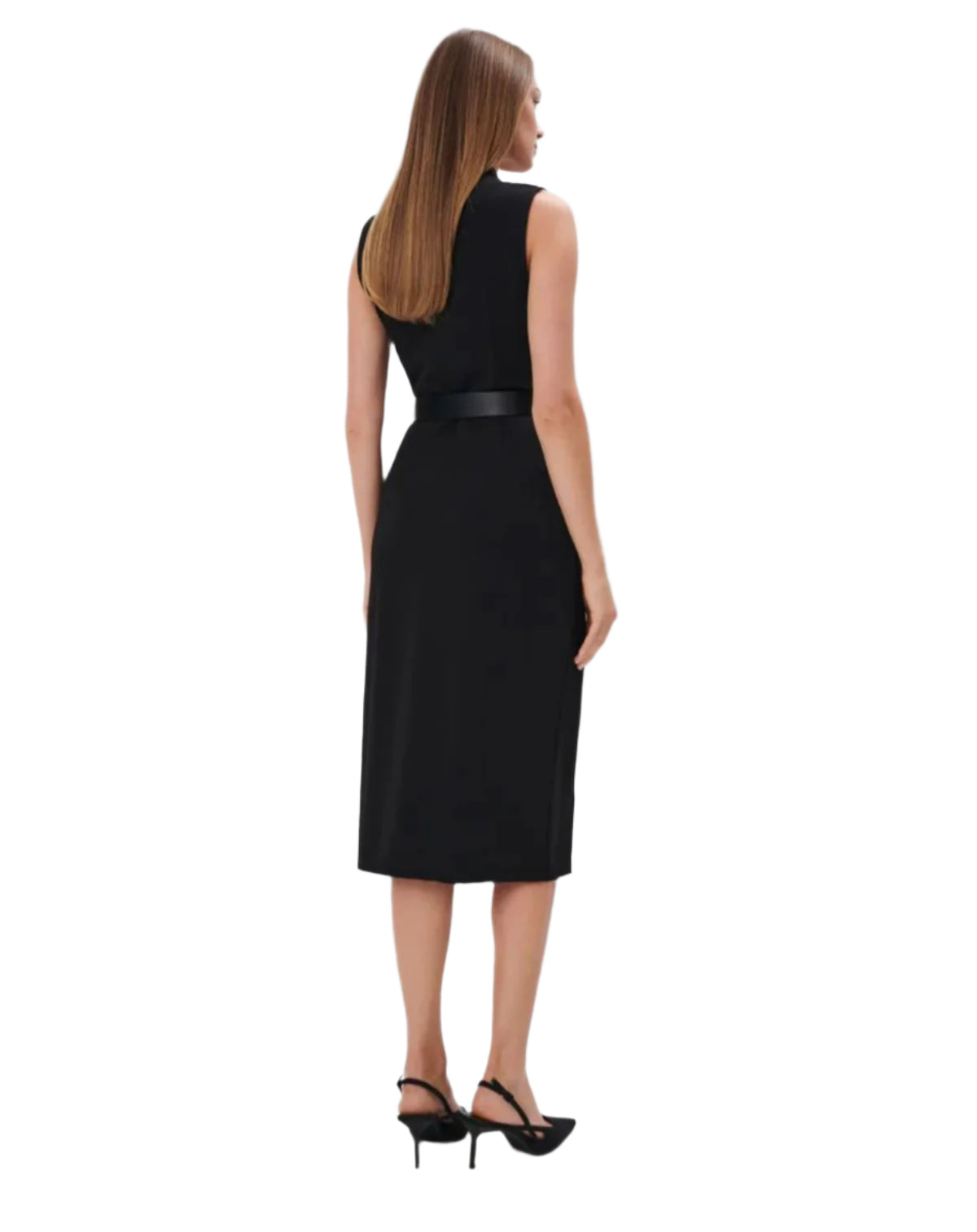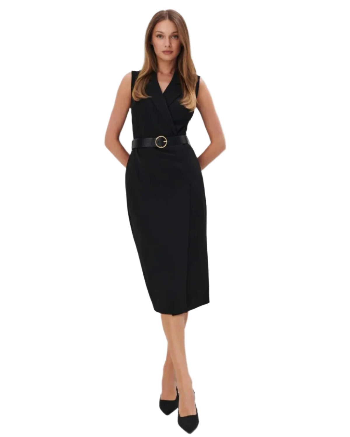 Címke nélküli, női midi ruha, fekete színű, ujjatlan, galléros kialakítású, V-kivágású, átlapolt fazon, deréknál övvel díszített, elöl sliccelt szoknyarésszel, elegáns és kifinomult viselet alkalmakra vagy üzleti megjelenéshez.