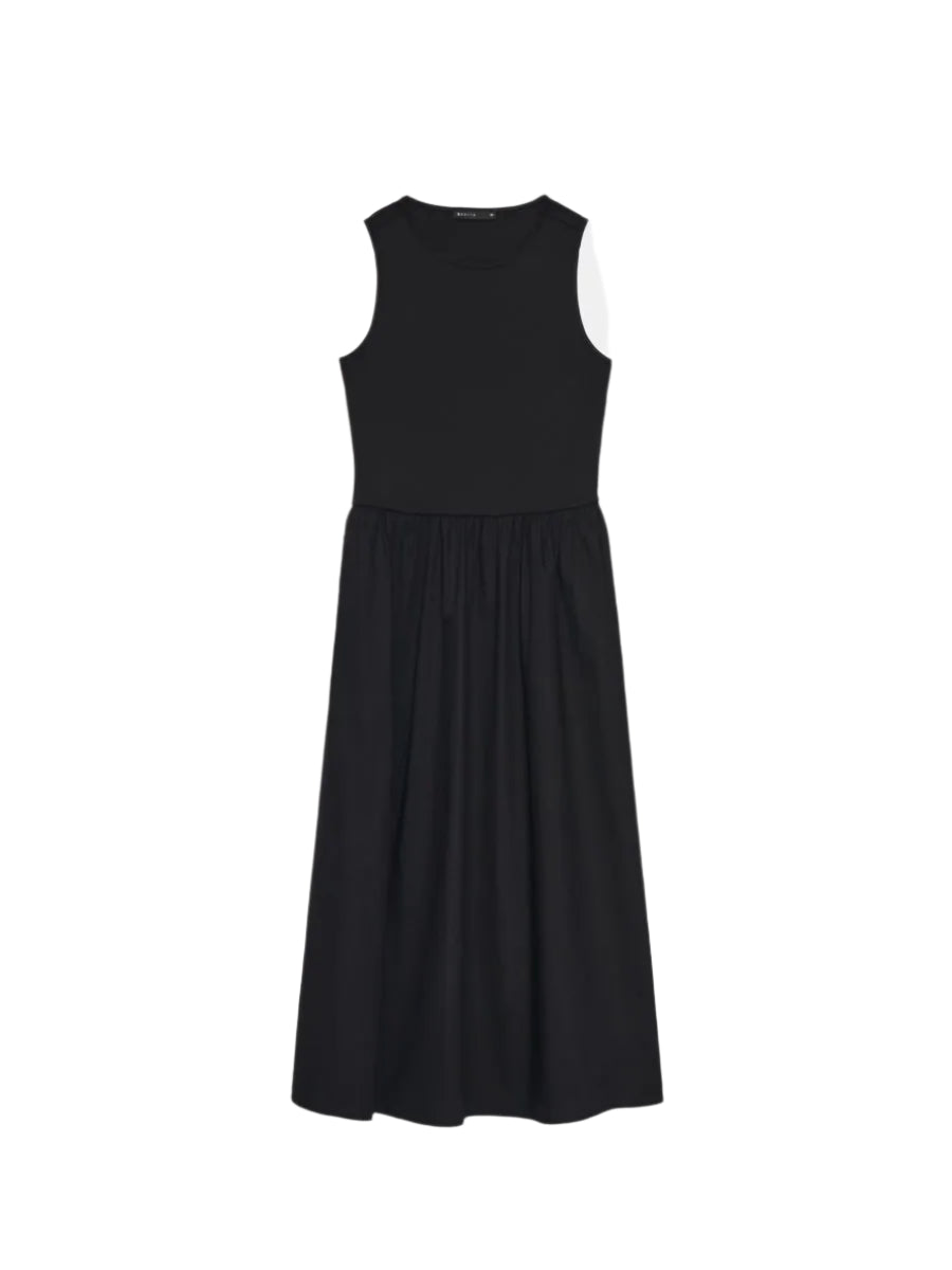Címke nélküli, fekete színű, ujjatlan midi ruha, amely letisztult és elegáns megjelenést biztosít. Felső része testhezálló, míg az alsó része bő szabású, így kényelmes és légies viseletet nyújt. Tökéletes választás hétköznapi és alkalmi megjelenéshez egyaránt.