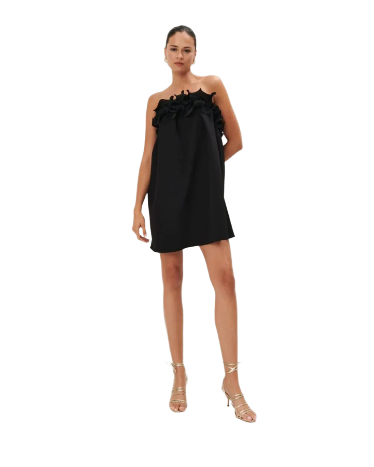 Címke nélküli, fekete színű, váll nélküli miniruha, amely elegáns és modern megjelenést biztosít. Felső része látványos fodrokkal díszített, laza szabása pedig kényelmes viseletet garantál. Tökéletes választás különleges alkalmakra, esti programokra vagy elegáns rendezvényekre.
