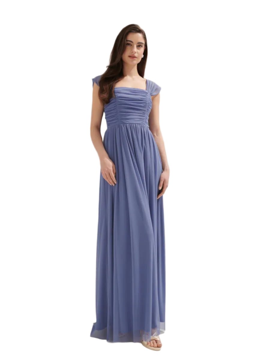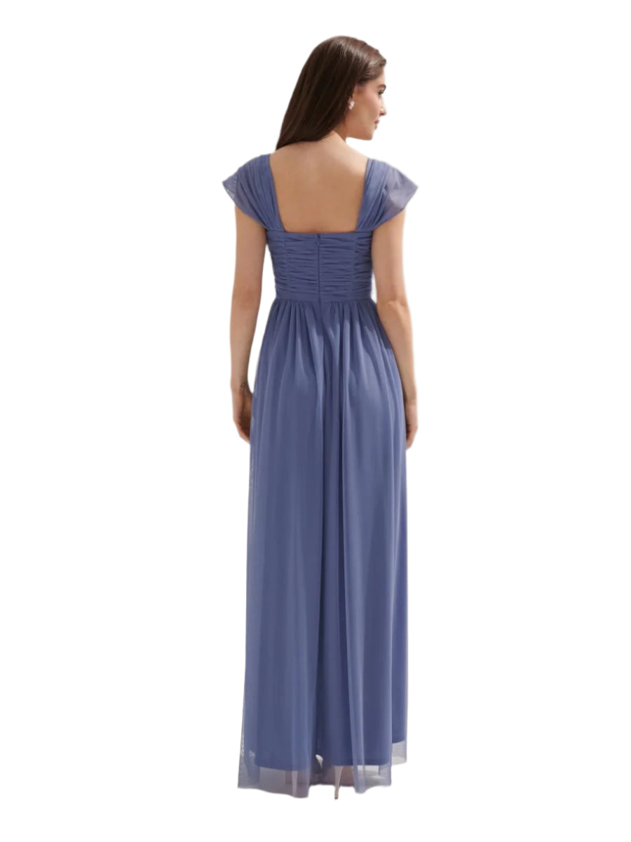Címke nélküli, elegáns kék maxi ruha finom tüll anyagból, ráncolt felsőrésszel és lágy esésű szoknyával. A rövid ujjú, négyzetes nyakkivágás klasszikus és nőies megjelenést biztosít. Ideális alkalmi eseményekre, esküvőkre vagy esti rendezvényekre.