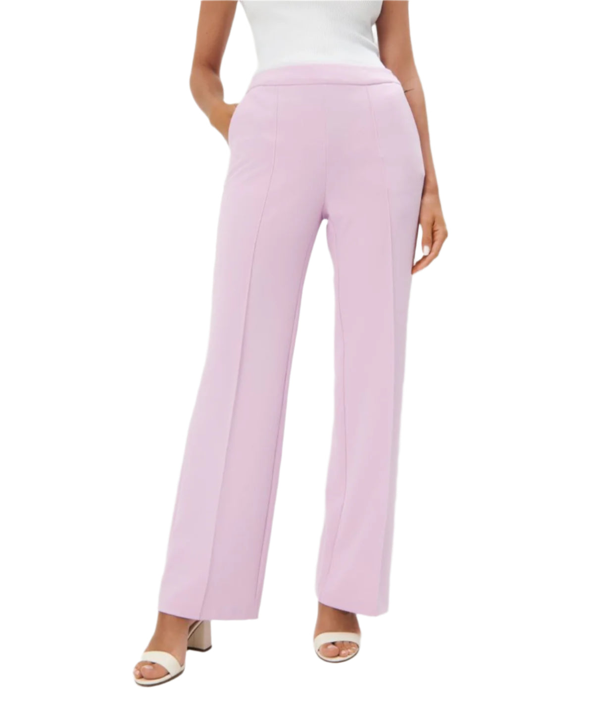 Címke nélküli, lila színű nadrág, elegáns bő szárú fazonnal és magasított derékrésszel. Kényelmes viselet, letisztult szabással, amely tökéletes választás alkalmi és elegáns megjelenéshez.