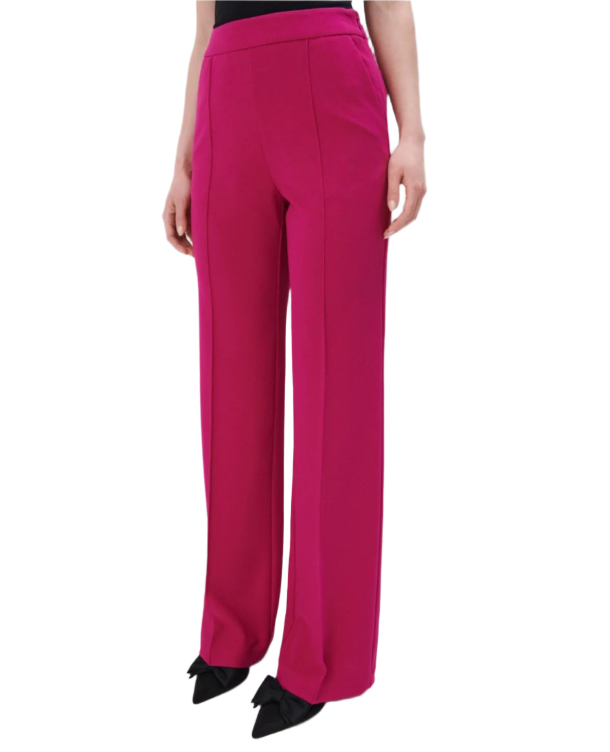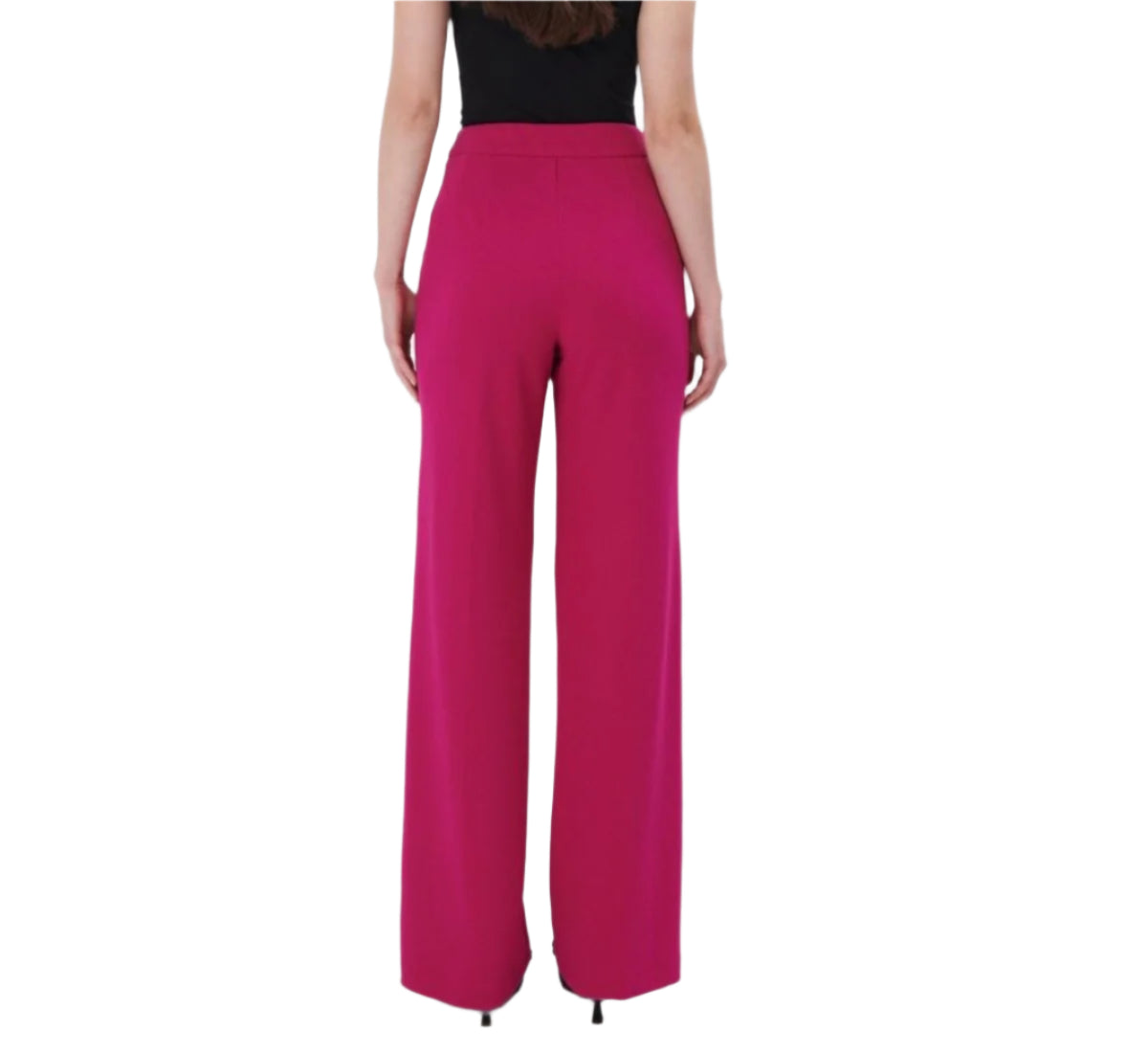 Címke nélküli, női elegáns nadrág, magenta színű, magas derekú, bő szárú fazon, varrott élvonallal, letisztult és kifinomult megjelenés, tökéletes választás irodai vagy alkalmi viselethez.